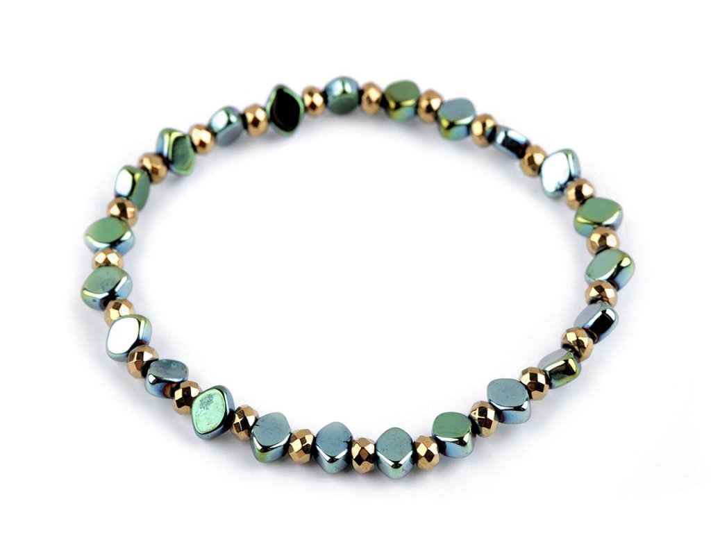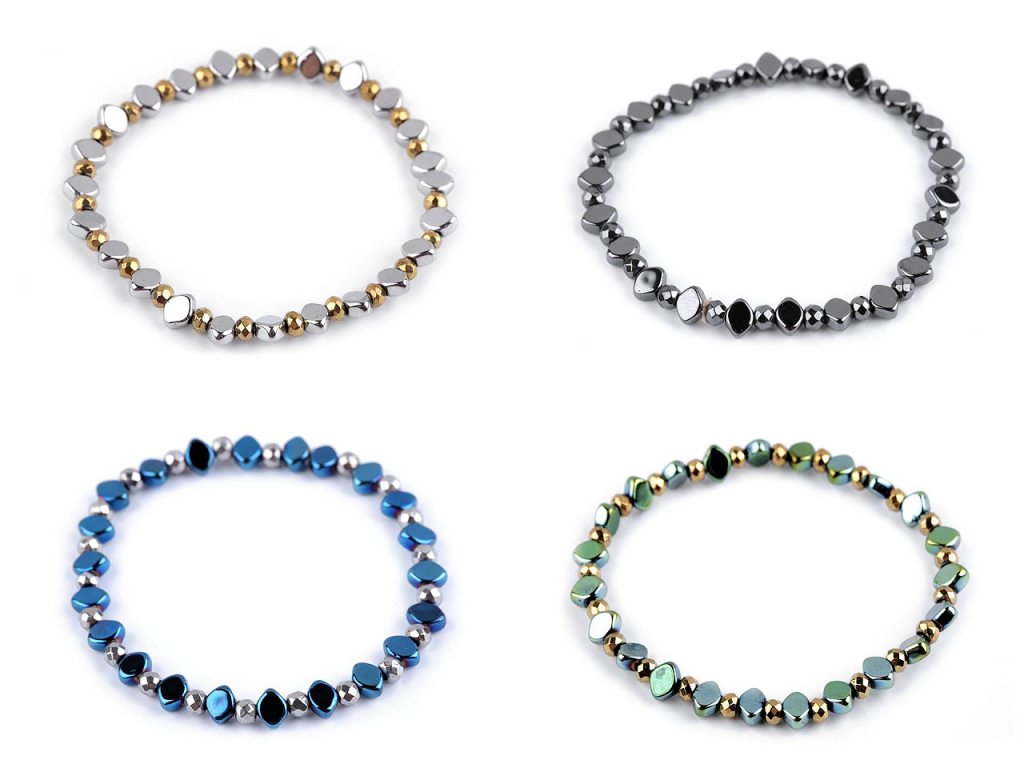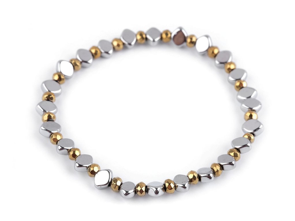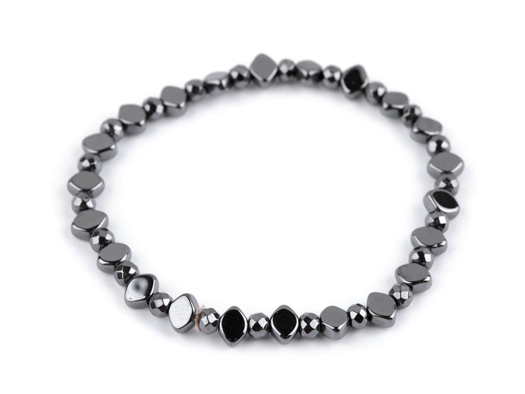 Elegantní náramek je vyrobený z broušených korálků pokoveného hematitu. Díky pružence se náramek snadno natáhne na ruku, má univerzální velikost. Hematitový náramek patří mezi šperky, které díky své fascinující povrchové úpravě zaujmou na první pohled. Broušené plošky vytvářejí efektní světelné odlesky. Náramek potěší každou ženu, je dárkem, se kterým nešlápnete vedle. Hodí se ke slavnostním příležitostem, skvěle podtrhne i business styl oblékání.