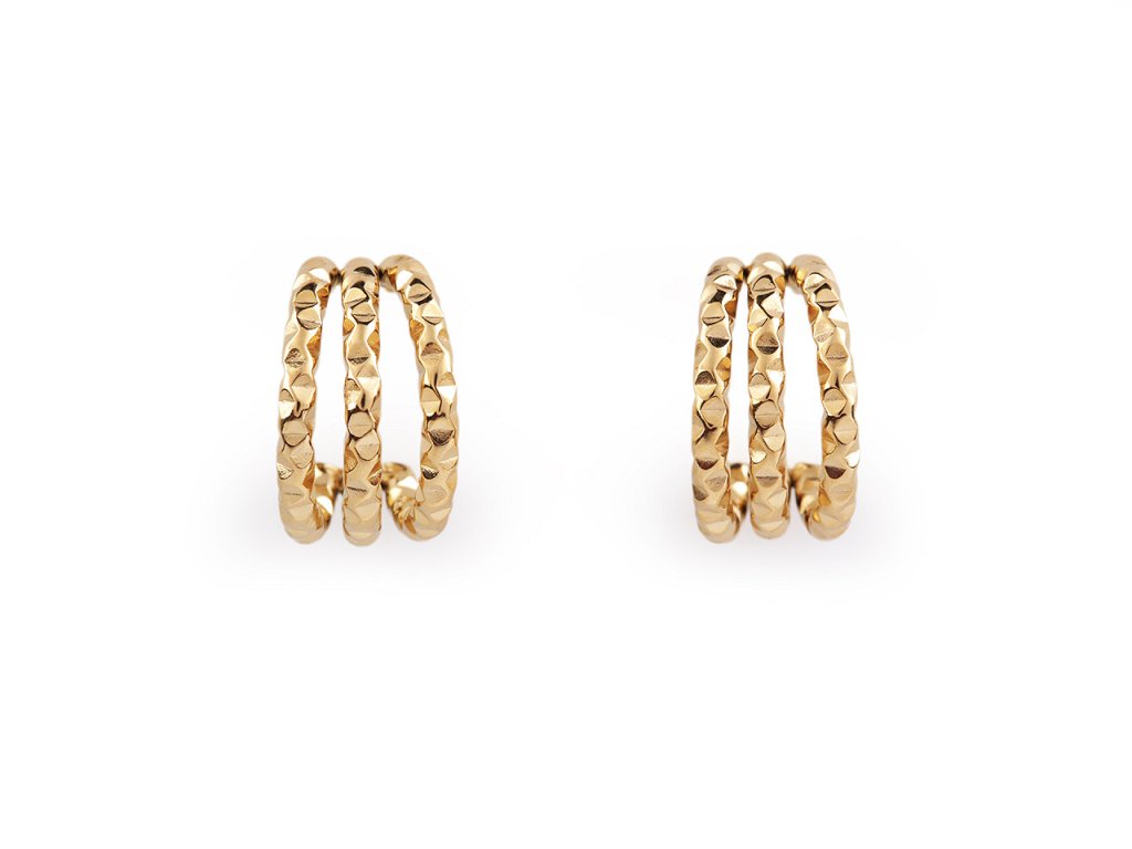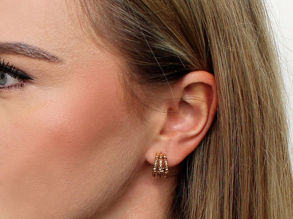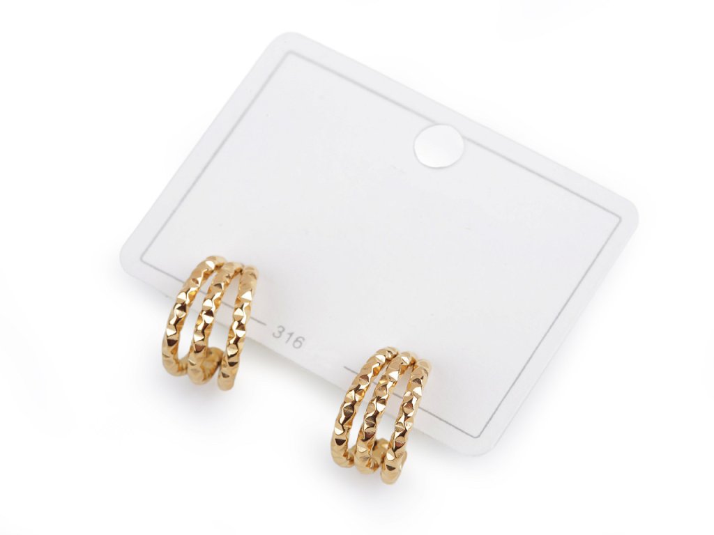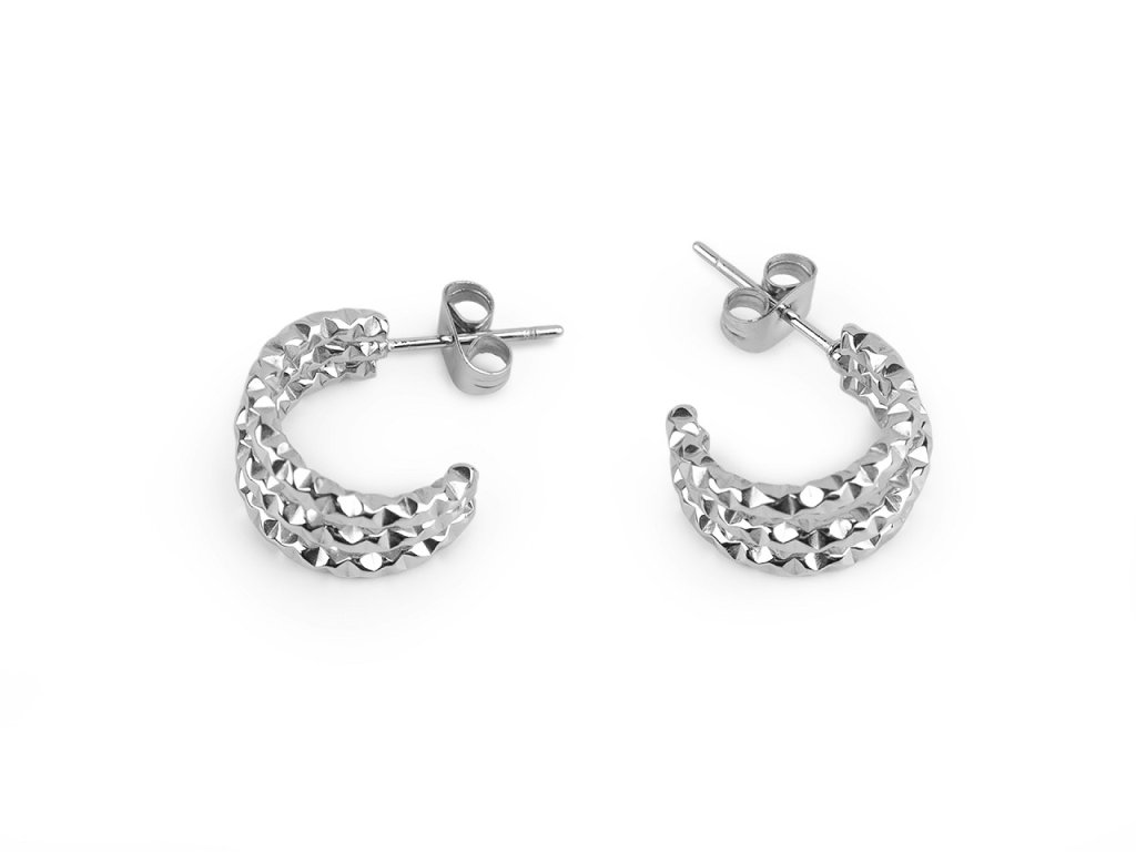 Elegantní náušnice z kvalitní nerezové oceli mají tvar neuzavřeného kruhu. Zaujmou svou strukturou a třemi spojenými řadami, skvěle doplní byznys styl oblékání, jeansovou módu, ležérní outfity i společenské šaty. Mají vysoký lesk, místy se třpytí.