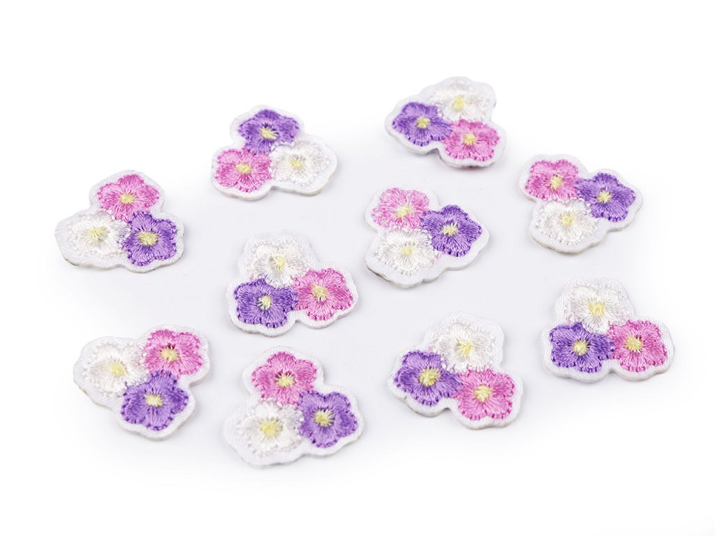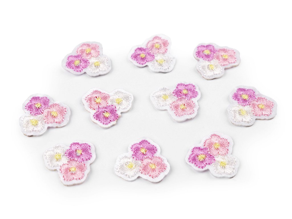 Nažehlovačka půvabných květů má kvalitní celoplošné vyšívání. Jemně se leskne. Potěší nejen děti, ale i dospělé. Vynikne jak na oblečení, tak na doplňcích jako jsou tašky, klobouky, ubrusy, prostírání, polštáře apod.