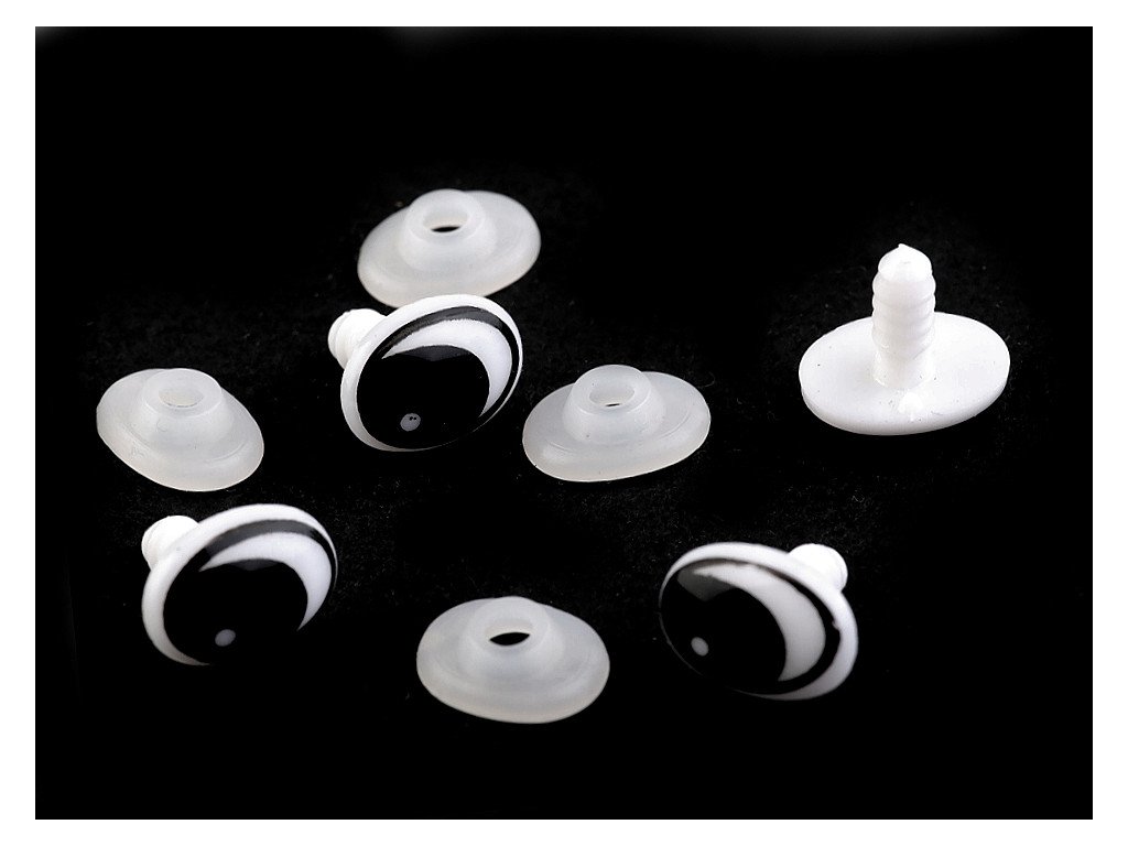 Oválné plastové oči se šibalským výrazem využijete pro výrobu různých zvířátek a postaviček např. plyšáků. Pro pevné přichycení mají oči na vrutu závity, které se pevně uchytí v materiálu používaném při výrobě plyšáků. Z druhé strany se nacvakne pojistka, která oči bezpečně zachytí na místo.