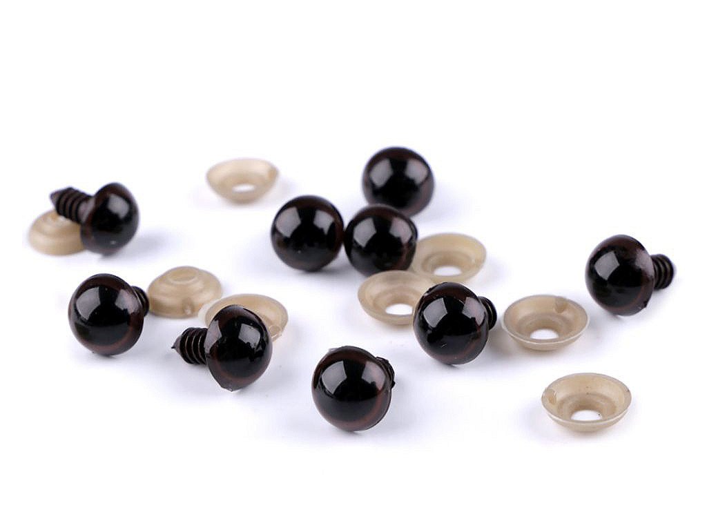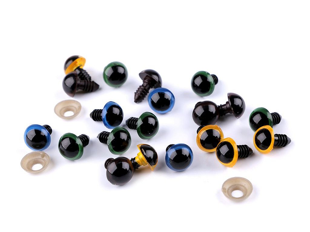 Polokulatá plastová očka využijete při výrobě nejrůznějších postaviček či zvířátek. Mají závit, který se provleče materiálem, a z druhé strany se pak nacvakne pojistka, která oči bezpečně připevní na místo.