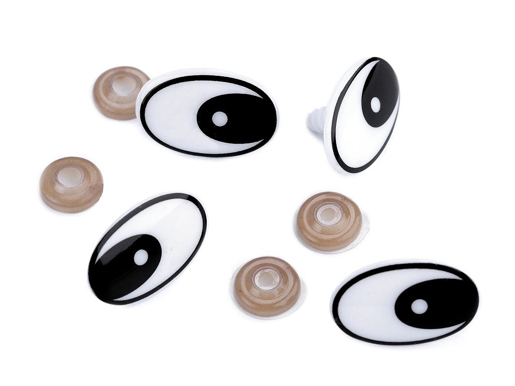 Bezpečnostní plastové oči s rošťáckým výrazem využijete pro výrobu různých zvířátek a postaviček, např. plyšáků. Pro pevné přichycení mají oči na vrutu závity, které se pevně uchytí v materiálu používaném při výrobě plyšáků. Z druhé strany se nacvakne pojistka, která oči bezpečně zachytí na místo.