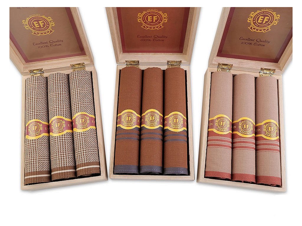 Elegantní pánské kapesníky jsou vhodným dárkem pro vaše blízké. Jsou uložené v dřevěné krabičce, která dodá darovanému dárku prestiž. Jsou vyrobené ze 100 % bavlny.Kapesníky mají čtvercový tvar o rozměrech 43 x 43 cm. V krabičce jsou nabalené po 3 ks.