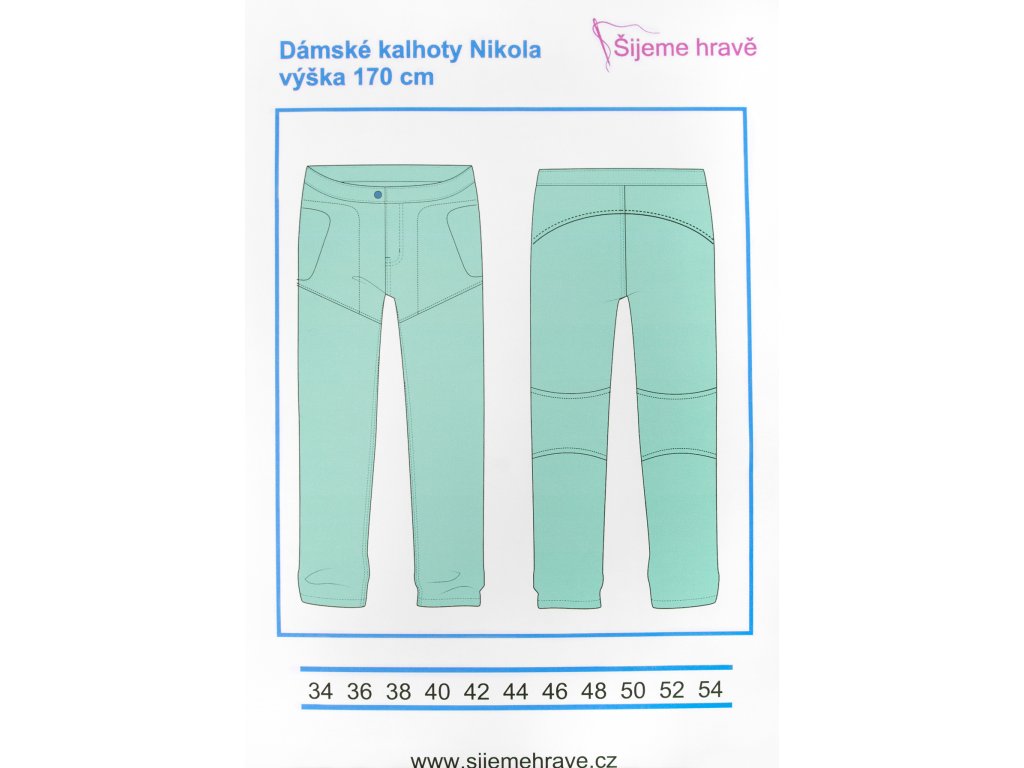 Dámské kalhoty Nikola jsou sportovního střihu, na předním díle mají dvě klínové kapsy do oblouku a rozparek se zapínáním na zip. Jsou konstruovány na plnější ženská stehna, nicméně součástí návodu je i informace, jak střih upravit na hubenější nohy.