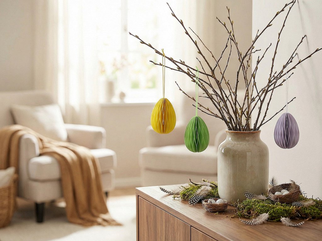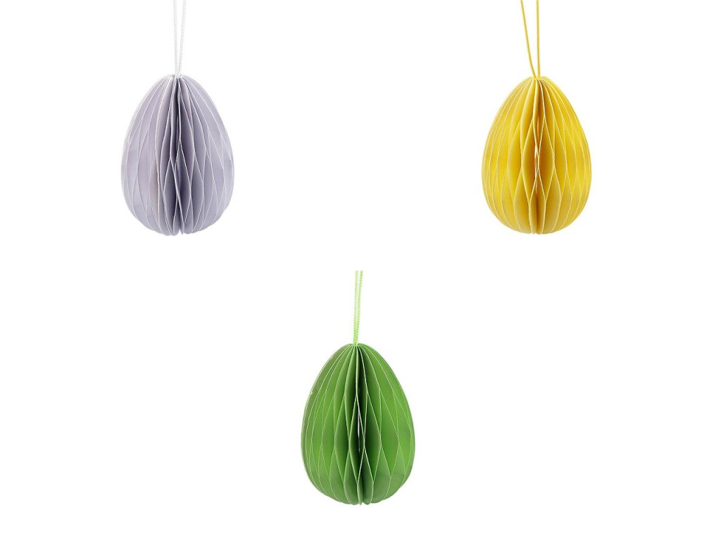 Závěsné vajíčko je vyrobené z plástvového papíru, který při roztažení vytváří efekt připomínající včelí plástve. Tento druh papíru má zajímavý 3D efekt. Díky poutku ho snadno pověsíte na větvičky ve váze, na dekorační věnce apod.