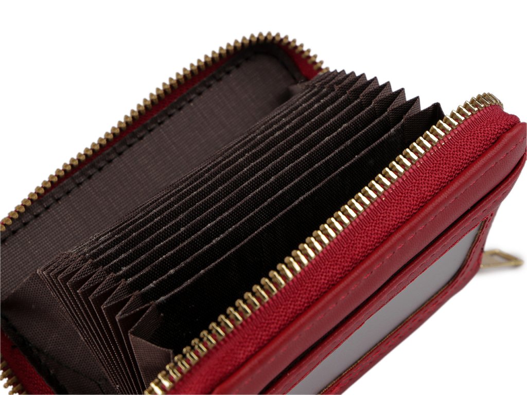 Peněženka je vyrobená z eko kůže, která je velice příjemná na dotek. Uzavírá se na zip. Po jejím otevření se objeví 11 přihrádek ve formě harmoniky. Na jedné vnější straně má peněženka ještě průhlednou přihrádku.