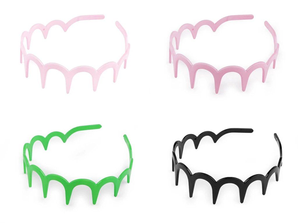 Plastová čelenka s obloučky a velkými zuby má lesklý a hladký povrch. Je vyrobená z kvalitního plastu, velmi dobře ve vlasech drží.