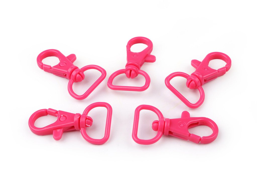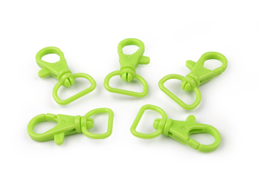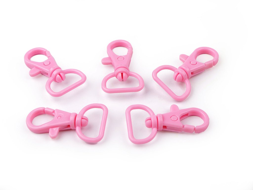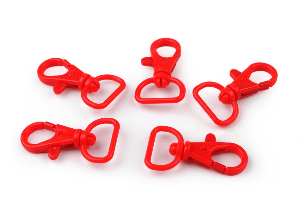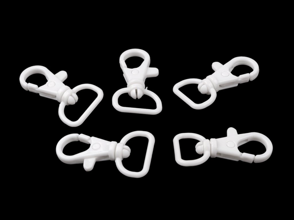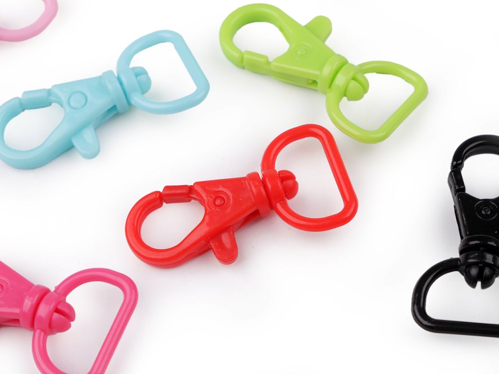 Plastová karabína s otočnou hlavou sa hodí na upevnenie popruhov k detským taškám, batôžkom a pod. Má malú hmotnosť, hodí sa aj na výrobu šnúrok na krk.