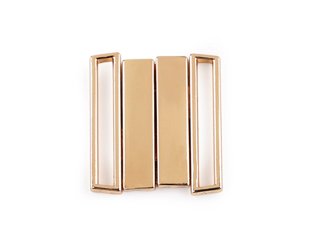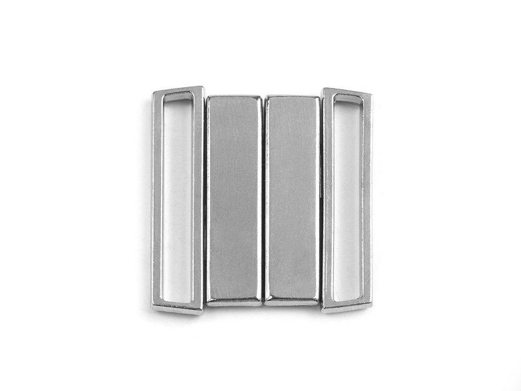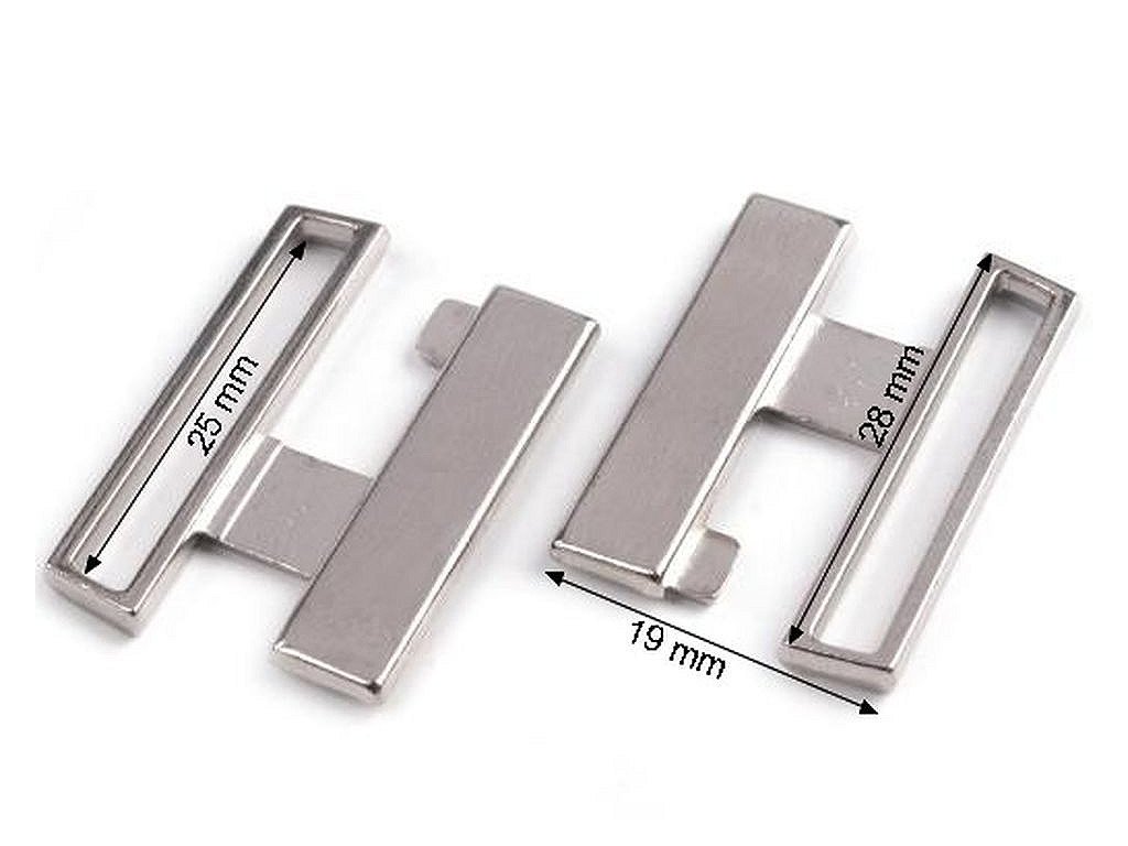 Zapínanie na plavky je vyrobené z kvalitného kovu. Zapína sa klasickým spôsobom, a to vsunutím jedného dielu medzi druhý diel. Vnútorná šírka pre uchytenie je 25 mm. Rozmery jednej spony sú 19 x 28 mm, oboch spon 25 x 28 mm, viď. foto.