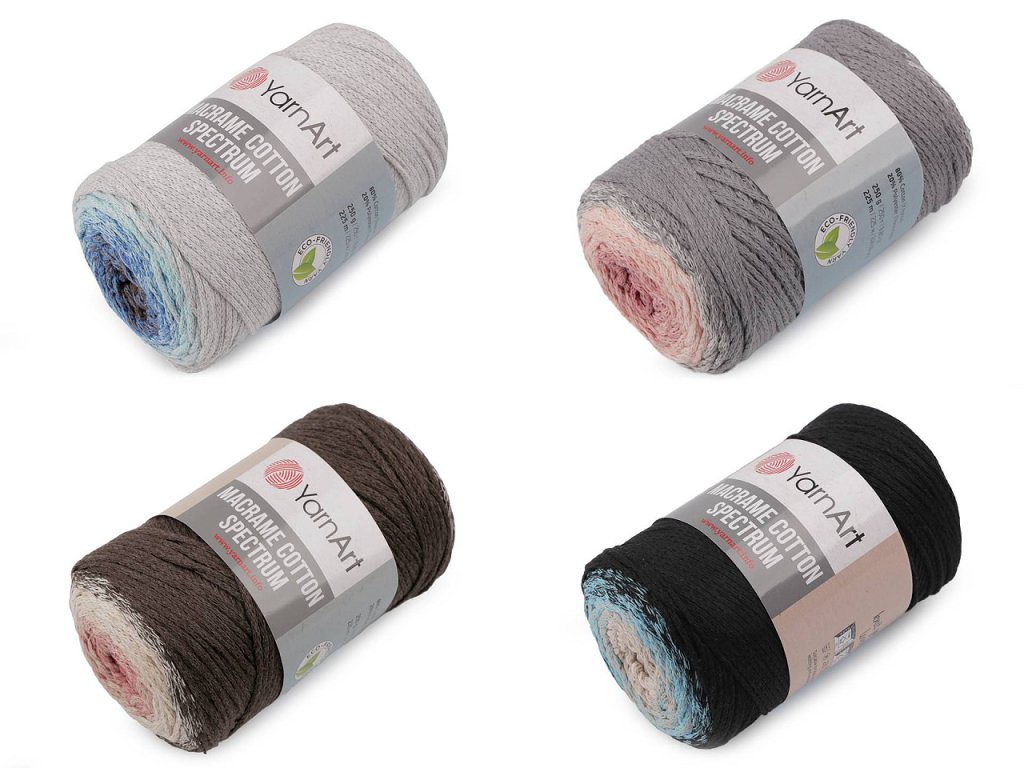 Priadza macramé Cotton Spectrum pripomína povrázok. Je zaujímavá svojimi farebnými prechodmi, s ktorými budú všetky výrobky vyzerať originálne. Využijete ju na pletenie alebo háčkovanie pufov, košíkov, koberčekov aj tašiek, kde úžasne vyniknú jej dúhové prechody farieb. Ihlice: 5 Veľkosť háčika: 5