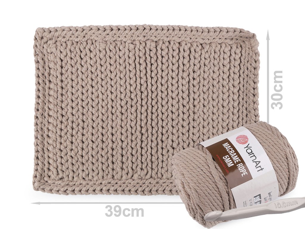 Priadza Macrame rope je krútená a pripomína povrázok. Využijete ju na pletenie alebo háčkovanie pufov, košíkov, koberčekov aj tašiek. Je vhodná aj na výrobu macramé dekorácií. Veľkosť ihlíc: 9 Veľkosť háčika: 10 Vzorka na fotografii (39 x 30 cm) bola uháčkovaná z 1 klbka, háčikom č. 10.