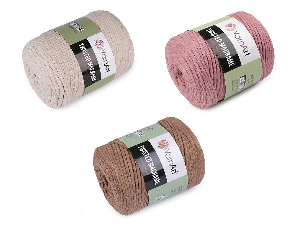 Priadza Twisted Macrame je krútená a pripomína špagát. Využijete ju na pletenie alebo háčkovanie pufov, košíkov, koberčekov aj tašiek. Je vhodná aj na výrobu macramé dekorácií. Veľkosť ihlíc: 9 Veľkosť háčika: 10 Vzorka na fotografii (88 x 27 cm) bola uháčkovaná z 1 klbka, háčikom č. 10.