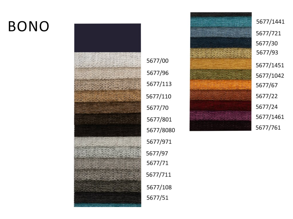 Potahová látka BONO žinylkového typu se vyznačuje zajímavou texturou a je dostupná v několika barevných provedeních. Je vysoce odolná vůči oděru, příjemná a vhodná především na čalounění nábytku.