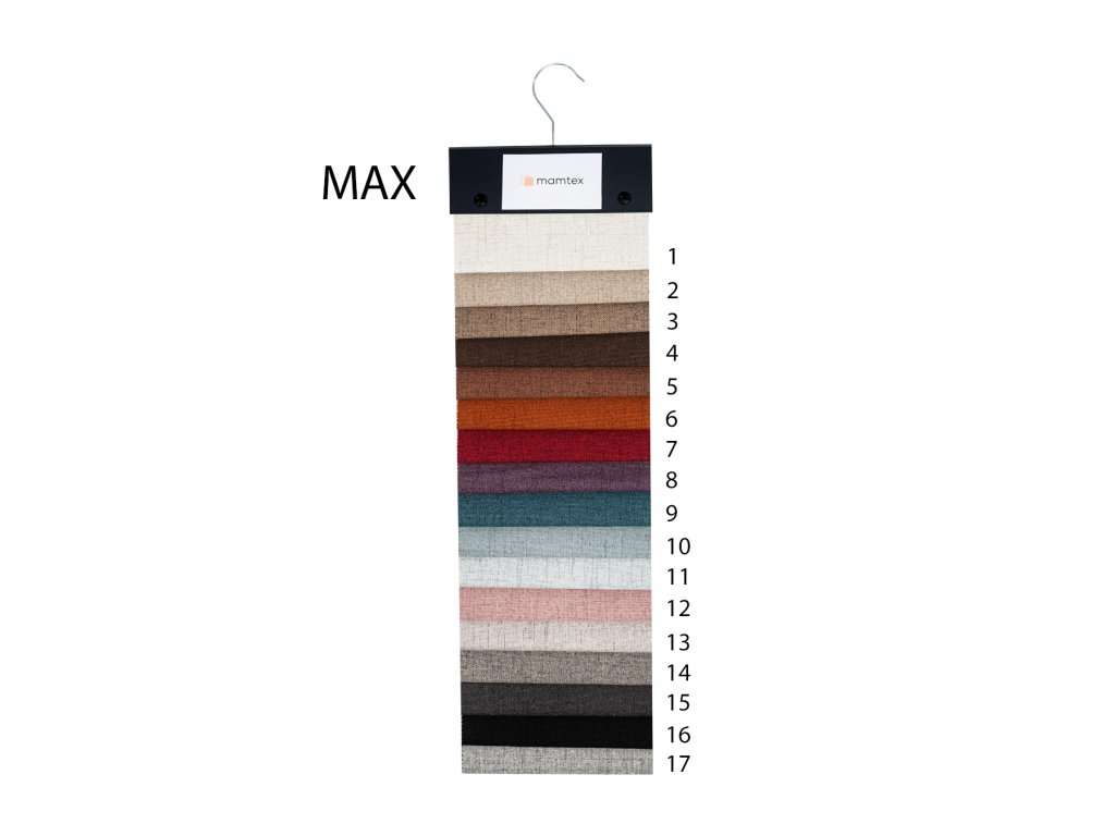 Potahová látka MAX je tkaná látka vyznačující se vysokou odolností a pestrými barvami. Disponuje také cigaretovým testem EN 1021-1. Vhodná pro čalounění nábytku v domácnosti.