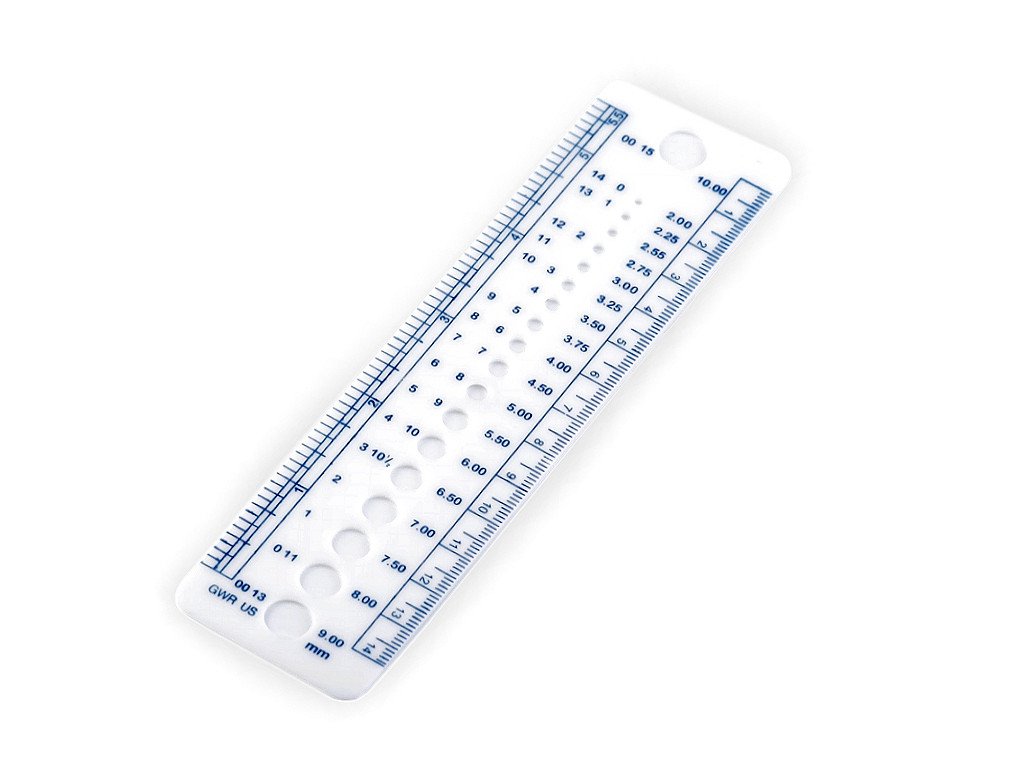 Pravítko na jehlice má otvory s uvedenou velikostí v mm, GWR a US. Budete tak mít přehled nejen v českých značeních, ale i v zahraničních. Po stranách jsou klasická pravítka. Jedno v milimetrech, druhé v palcích.
