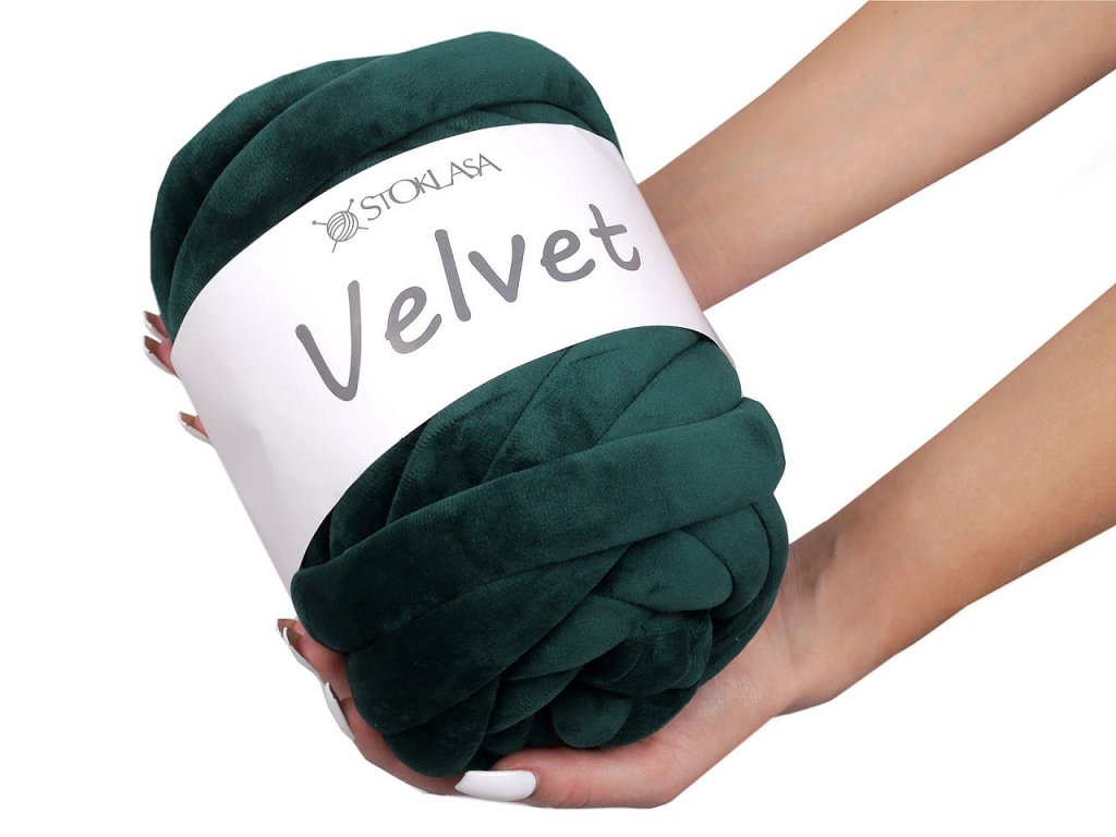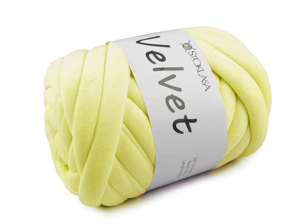 Silná příze Velvet je objemná, měkká a velmi příjemná na dotek. Tvoří ji tunýlek vyplněný vláknem. Dobře se vám s ní bude pracovat velkými jehlicemi nebo rukama.