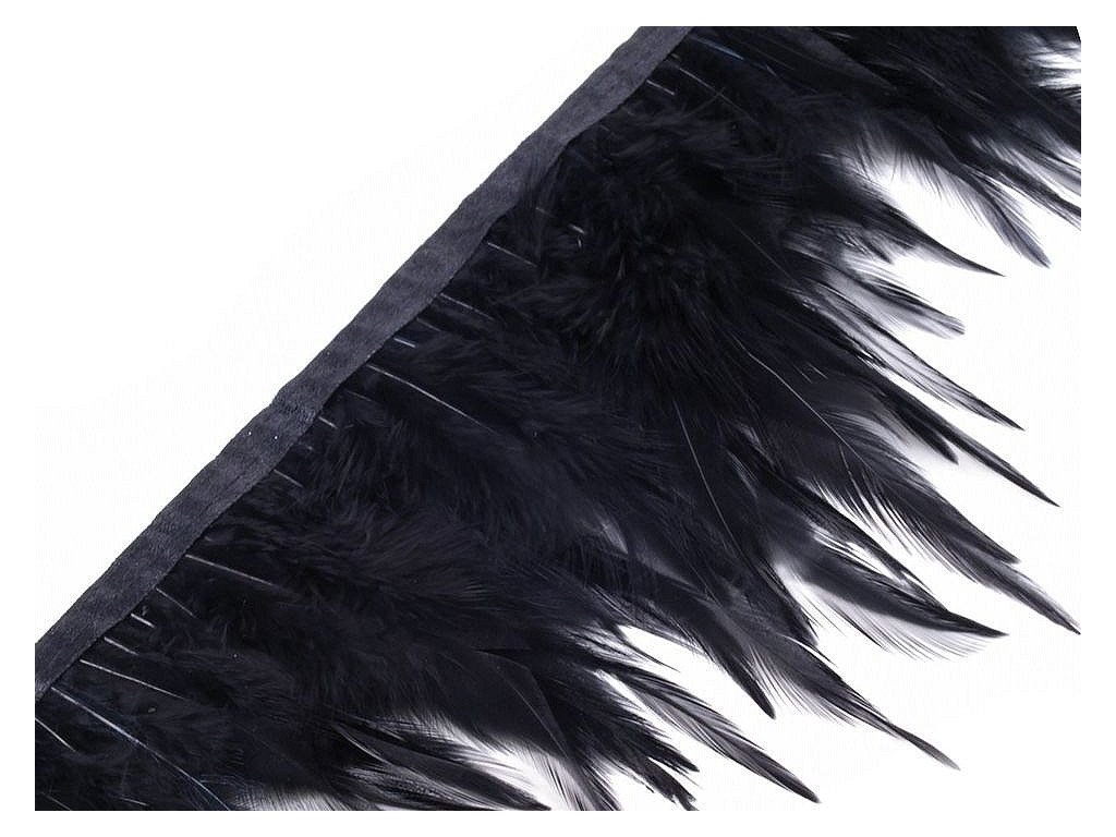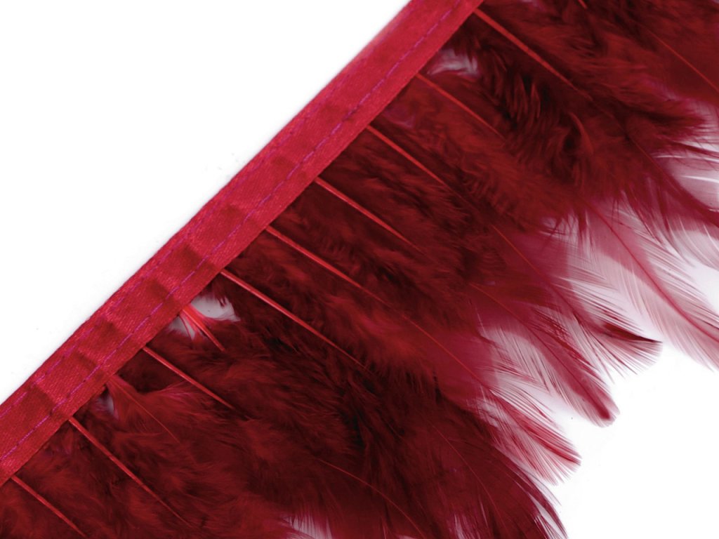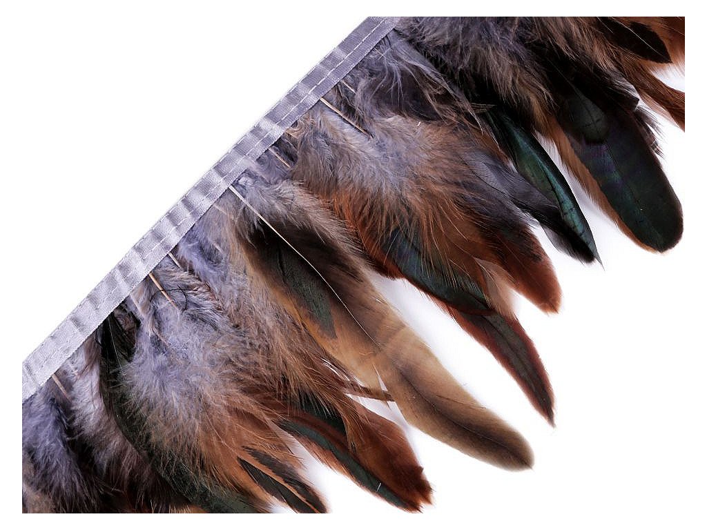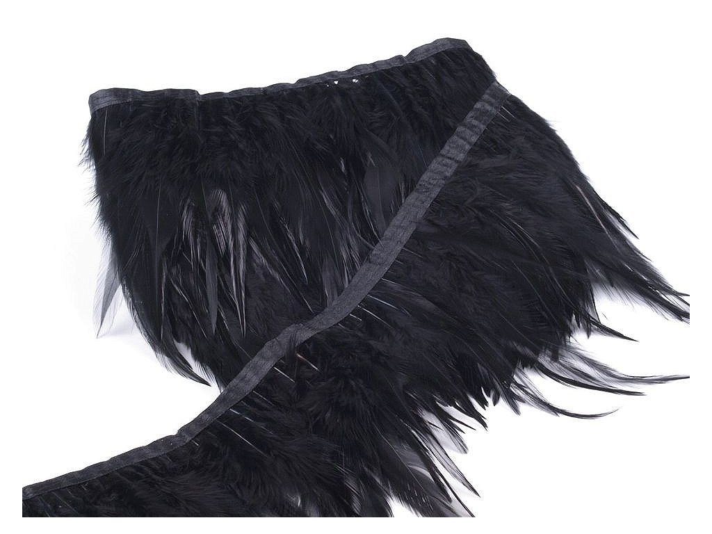 Prýmek z kohoutího peří působí originálně. Peří je do prýmku uchyceno saténovou stuhou a pevně prošito.