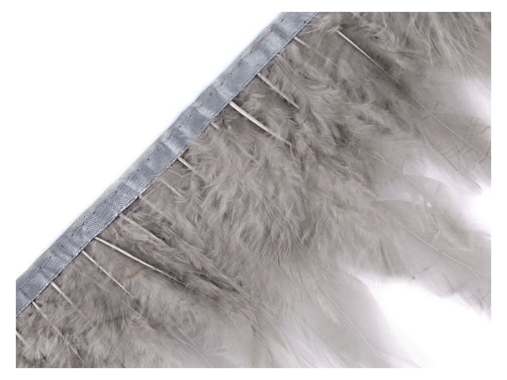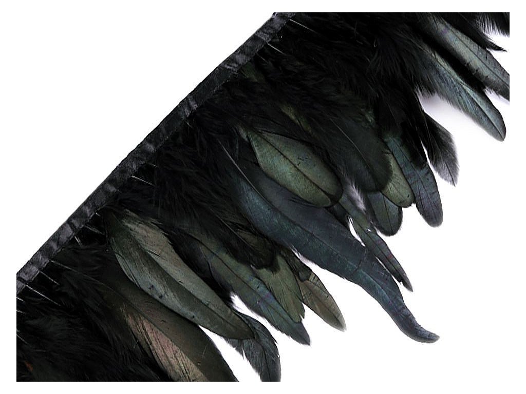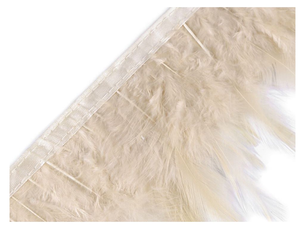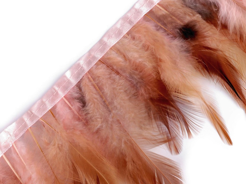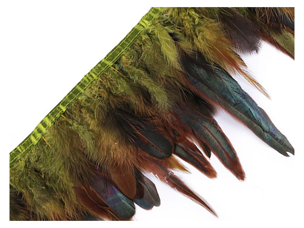 Prýmek z kohoutího peří působí originálně. Peří je do prýmku uchyceno saténovou stuhou a pevně prošito.