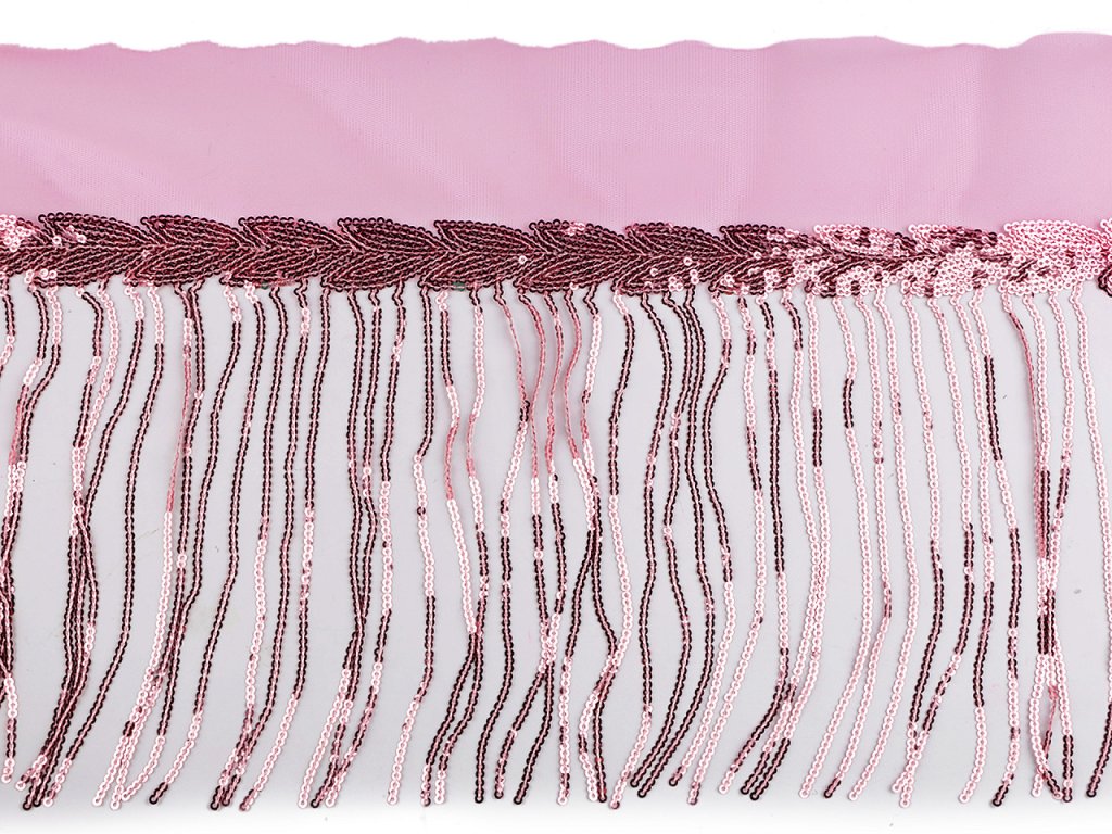 Prýmek na monofilu zdobí flitrová bordura s lístky a třásně s flitry, díky kterým působí elegantně a luxusně. Prýmek využijete ke zdobení tanečních šatů i společenských a plesových šatů, kde jejich lesk a třpyt skvěle vynikne při pohybu.