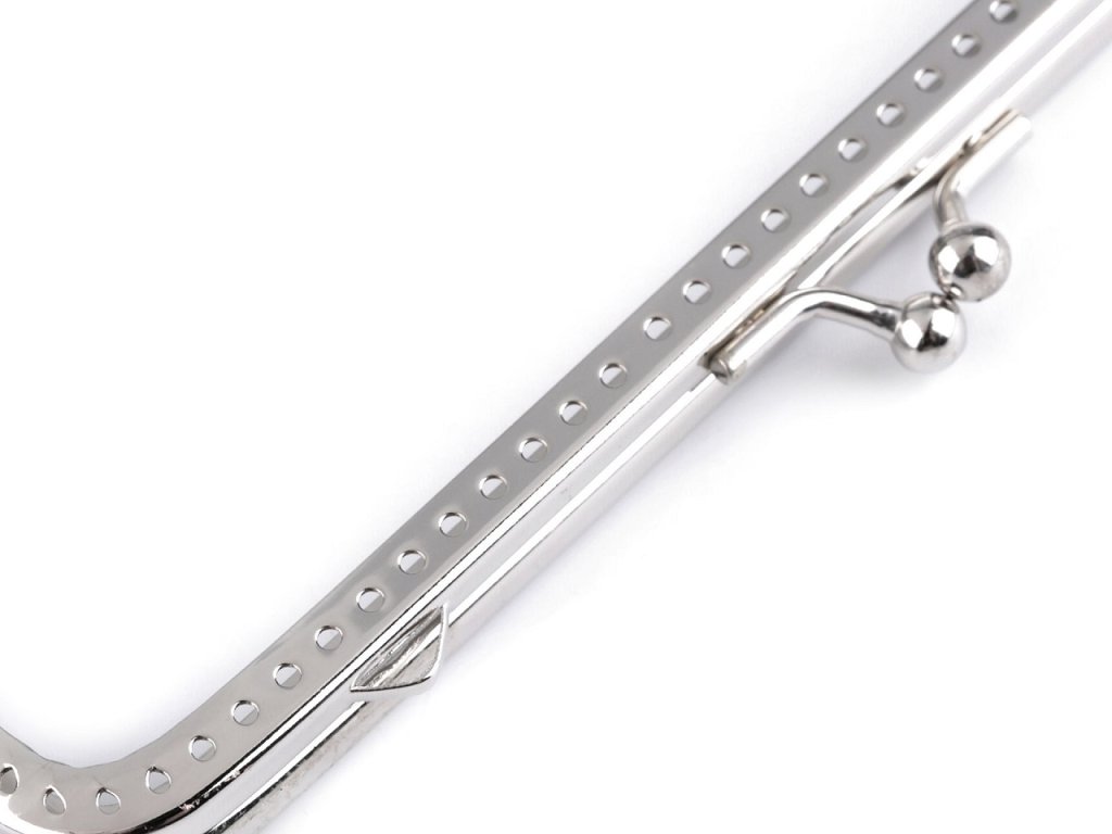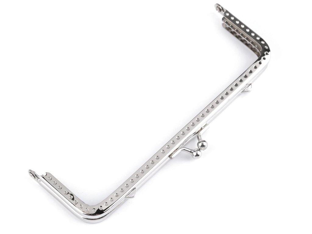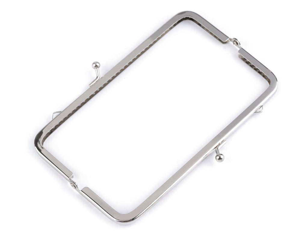 Kovový rámček so zapínaním na výrobu kabelky. Rámček sa prišíva, látka sa vloží do vnútra a ručne prešije cez dierky, ktorých rozpätie je 4 mm. Dierky sú len na vonkajšej strane rámčeka. Tento typ zapínania využijete určite na akýkoľvek typ kabelky, či už spoločenskej alebo určenej na bežné nosenie. Vnútorné rozmery rozvoru sú 14,3 x 8,2 cm. Vonkajšie rozmery rozvoru sú 15,5 x 9,2 cm. Výška zatvoreného rámčeka vrátane zapínania je 5 cm.