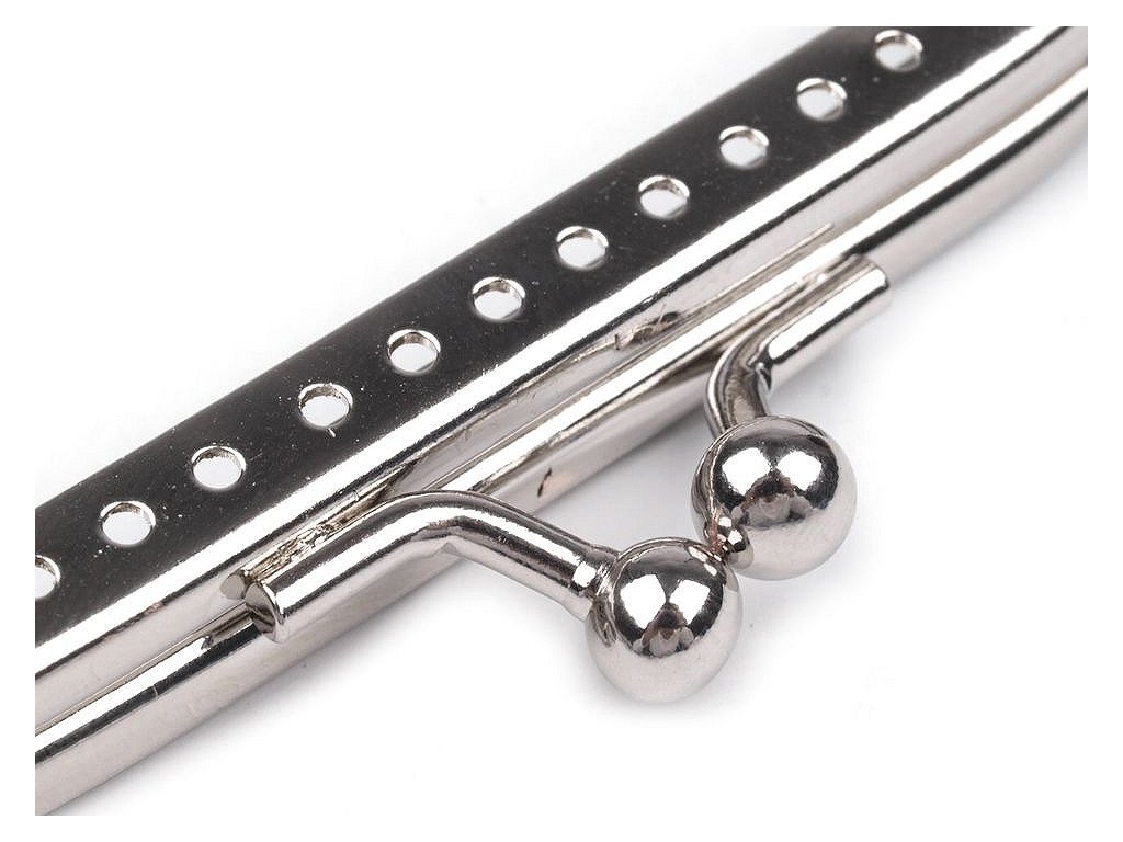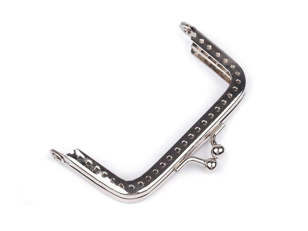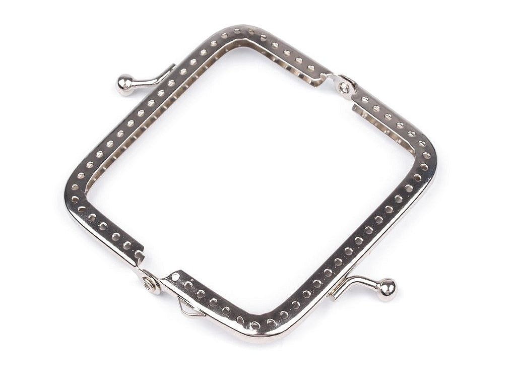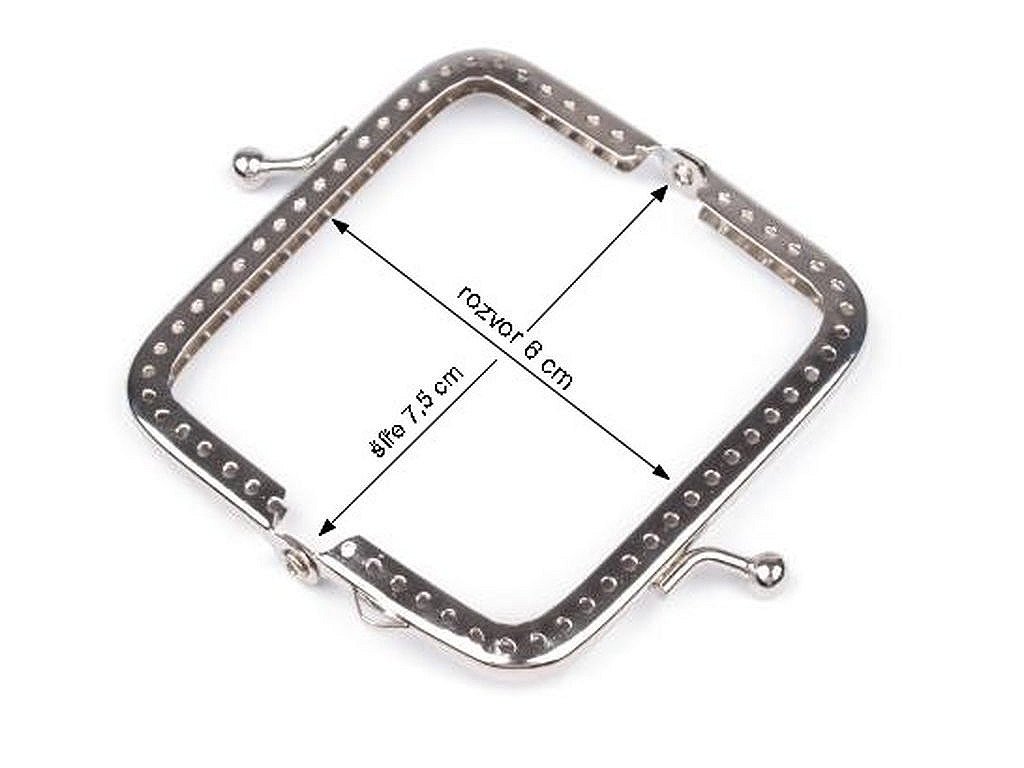 Rámček so zapínaním na výrobu peňaženky.Rámček sa ručne prešije cez dierky, ktorých rozpätie je 4 mm.Dierky sú len na vonkajšej strane rámčeka. Tento typ zapínania využijete určite na akýkoľvek typ peňaženky. Zadná strana rámčeka nemá dierky. Pri šití zapichnite ihlu z vnútra kabelky pod rámčekom tak, aby ste ju vytiahli na prednej strane presne pod prvou dierkou rámčeka. Potom zapichnite ihlu do dierky, ale trochu kolmo, aby nenarazila do vnútra rámčeka. Potom ihlu z vnútra zapichnite pod rámčekom tak, aby ste ju vytiahli na prednej strane u vedľajšej dierky, a opäť sa prešije dierkou.Pozrite sa na návod na výrobu plstenej kabelky, kde je rámček využitý. Vnútorné rozmery rozvoru sú 7,5 x 6 cm. Vonkajšie rozmery rozvoru sú 8 x 7,5 cm. Výška zatvoreného rámčeka je 4 cm.