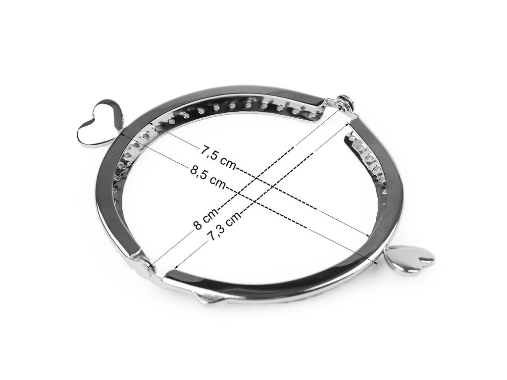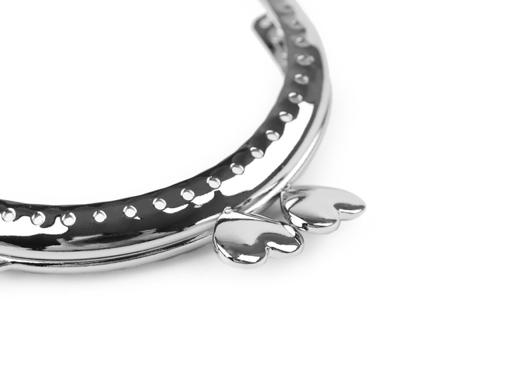 Kovový rámček je vhodný na výrobu malej peňaženky. Vďaka zatváraniu so srdiečkami pôsobí romanticky. Rámček je určený na našitie, kedy sa látka dovnútra vloží a ručne prešije cez dierky, ktorých rozpätie je 5 mm. Dierky sú len na vonkajšej strane rámčeka, ktorá je dlhšia ako vnútorná, teda je našívanie jednoduchšie. Vnútorné rozmery rázvoru sú 7,3 x 7,5 cm. Vonkajšie rozmery rázvoru sú 8,5 x 8,7 cm. Výška zatvoreného rámčeka je 4,5 cm (vrátane zapínania 5,8 cm).