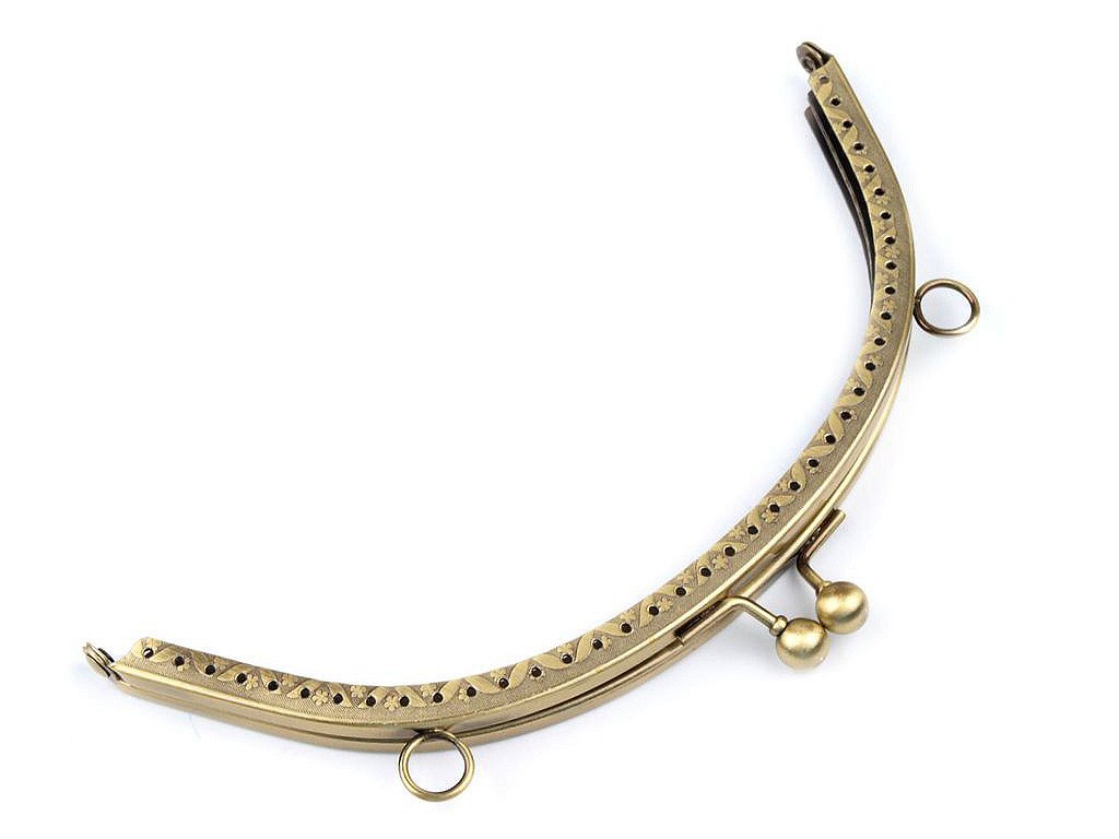 Kovový rámeček se zapínáním na výrobu kabelky. Zapínání má nahoře úchyty na ucha o průměru 1 cm. Rámeček je určený k našití, kdy se látka dovnitř vloží a ručně přešije přes dírky, jejichž rozpětí je 6 mm. Dírky jsou jen na vnější straně rámečku. Tento typ zapínání využijete určitě na jakýkoliv typ kabelky, ať už společenské nebo určené ke všednímu nošení.