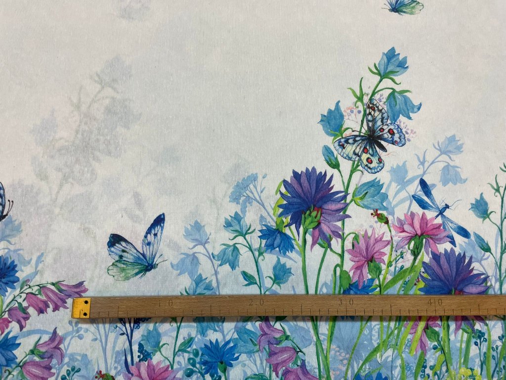 Režná bavlna oboustranná bordura modré a fialové květy s motýly a vážkami
