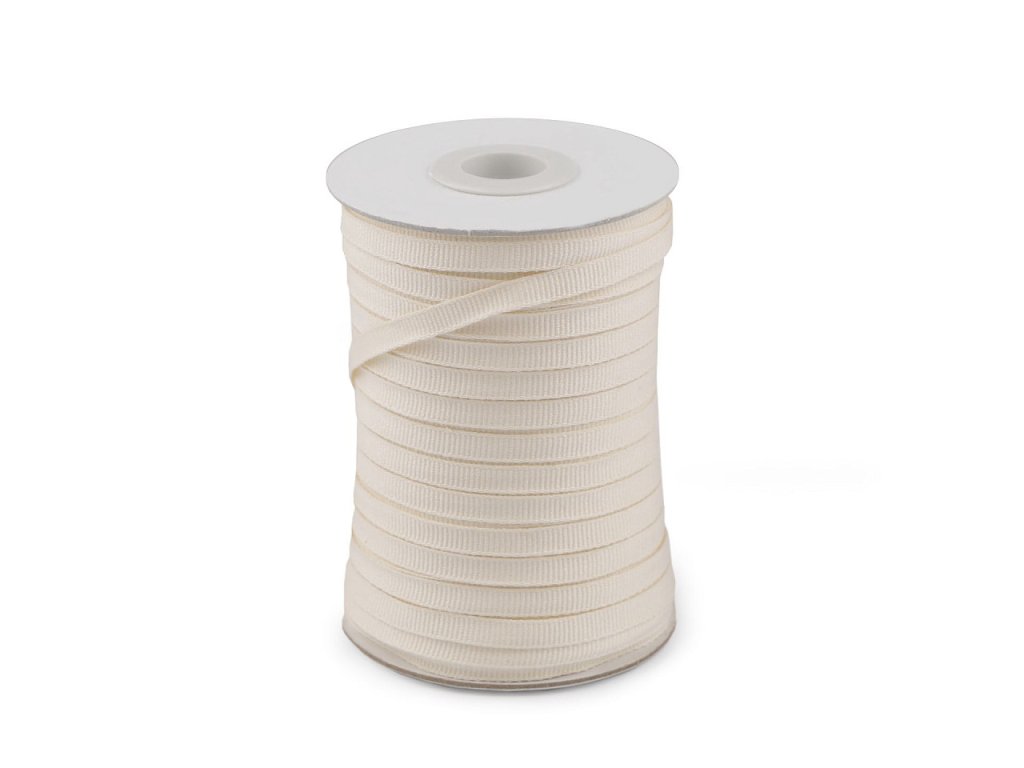 Kvalitní pevná stuha s hrubší rypsovou strukturou je vyrobená z bavlny. Je jednostranná, zadní strana je hladší. Stuha má jemný lesk.