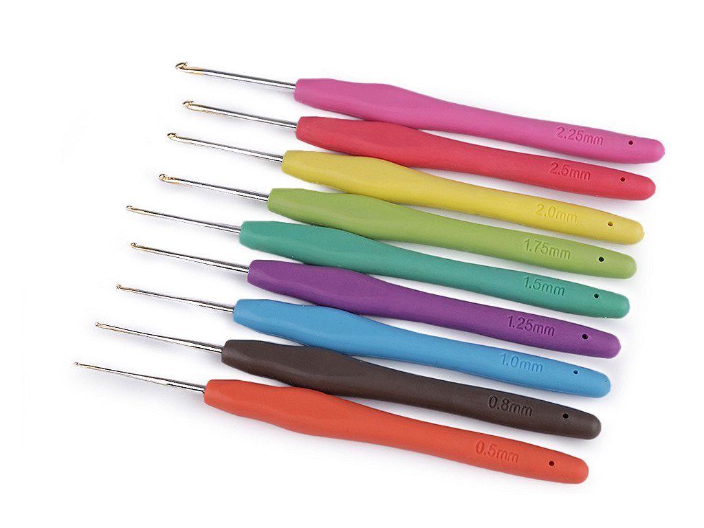 Sada háčikov na hačkovanie obsahuje 9 háčikov nasledujúcich veľkostí: 0,5; 0,8; 1; 1,25; 1,5; 1,75; 2; 2,25; 2,5. Majú silikónovú rukoväť, ktorá sa pohodlne drží. Háčiky sú vhodné na tenšie priadze.