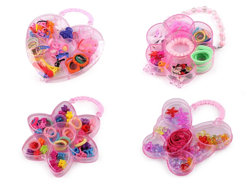 Sada malých ozdob a gumiček do vlasů je ideální pro holčičky, které rády vytvářejí zajímavé účesy. Všechny pomůcky jsou ukryté v transparentním boxu s uchem.