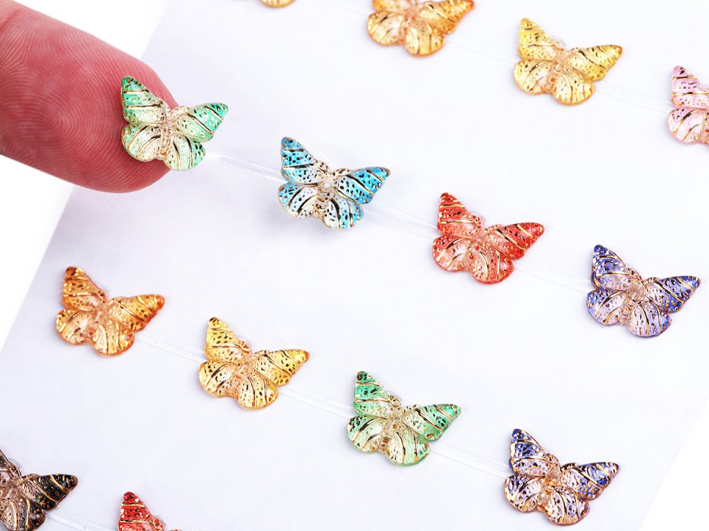 Kamienky v tvare motýlikov sú veľmi pútavé, majú jemné prefarbenie so zlatou potlačou žiliek . Všetky sú nalepené na jednom archu podkladovej fólie, z ktorej ich stačí sňať. Motýliky sú v radoch navzájom spojení lepiacim prúžkom, takže tvoria pásiky. Celkom tu nájdete 6 pásikov (v každom sú 4 motýliky). Môžete ich aj nastrihať na jednotlivé kúsky. Ozdoby odporúčame lepiť na suchý, hladký a pevný povrch. Využijete ich na zdobenie mobilov, tabletov, počítačov, prianí, krabičiek, zrkadiel, rámčekov fotografií, kvetináčov, denníkov, fotoalbumov a pod.