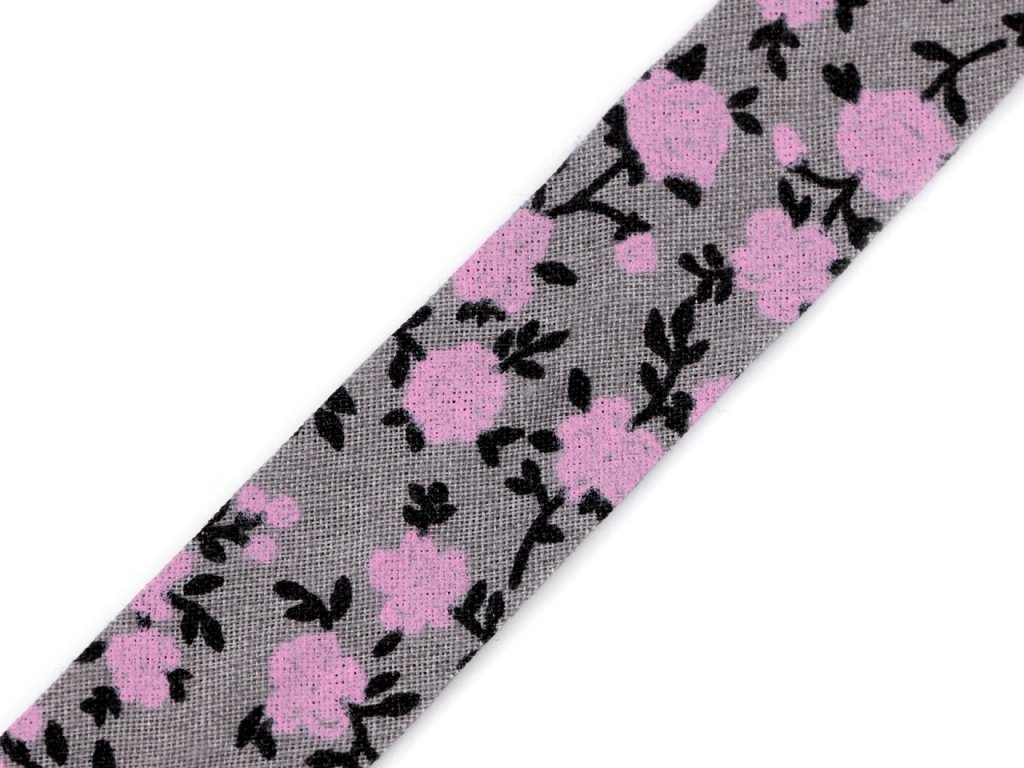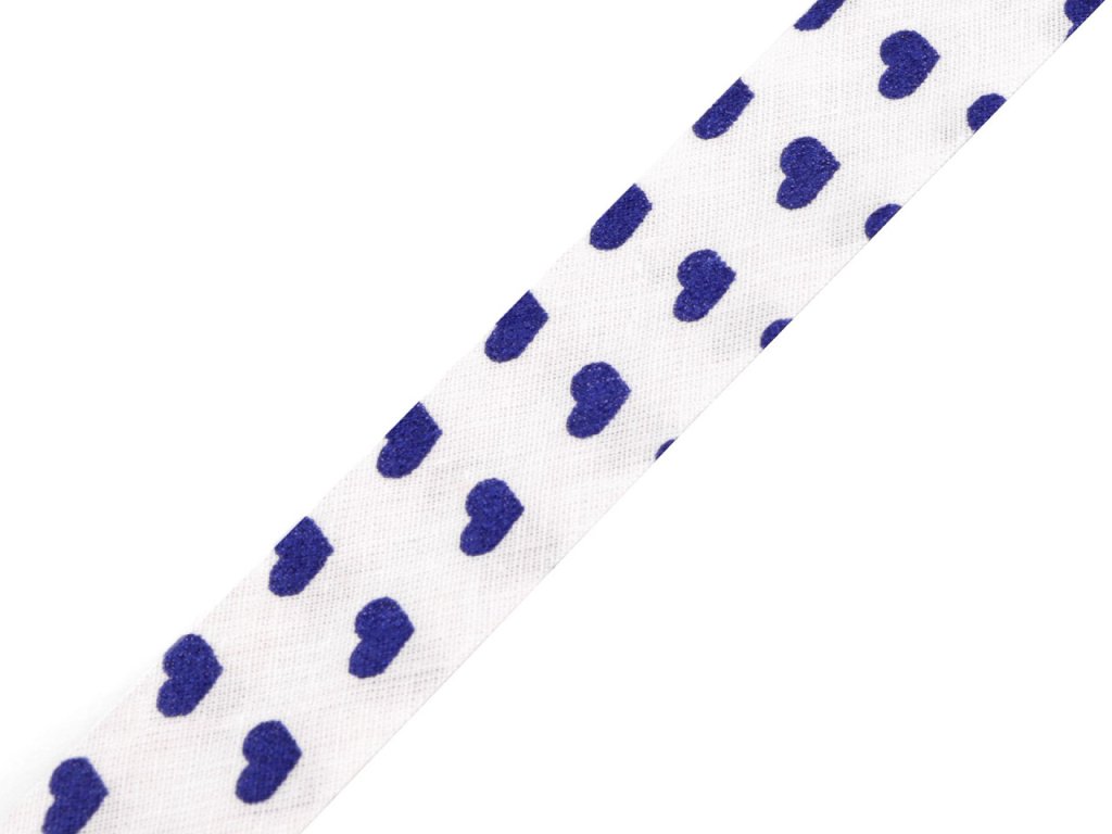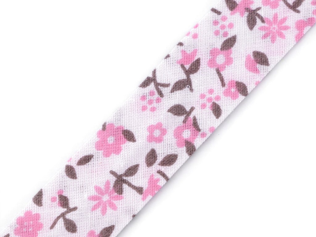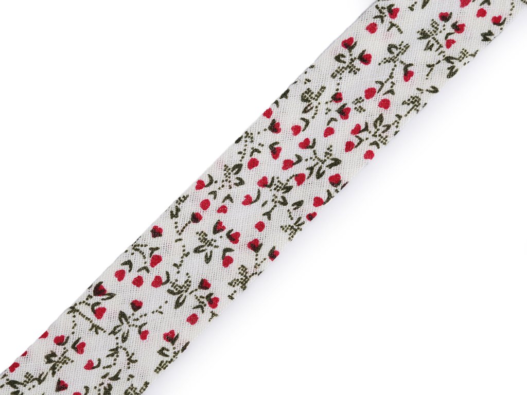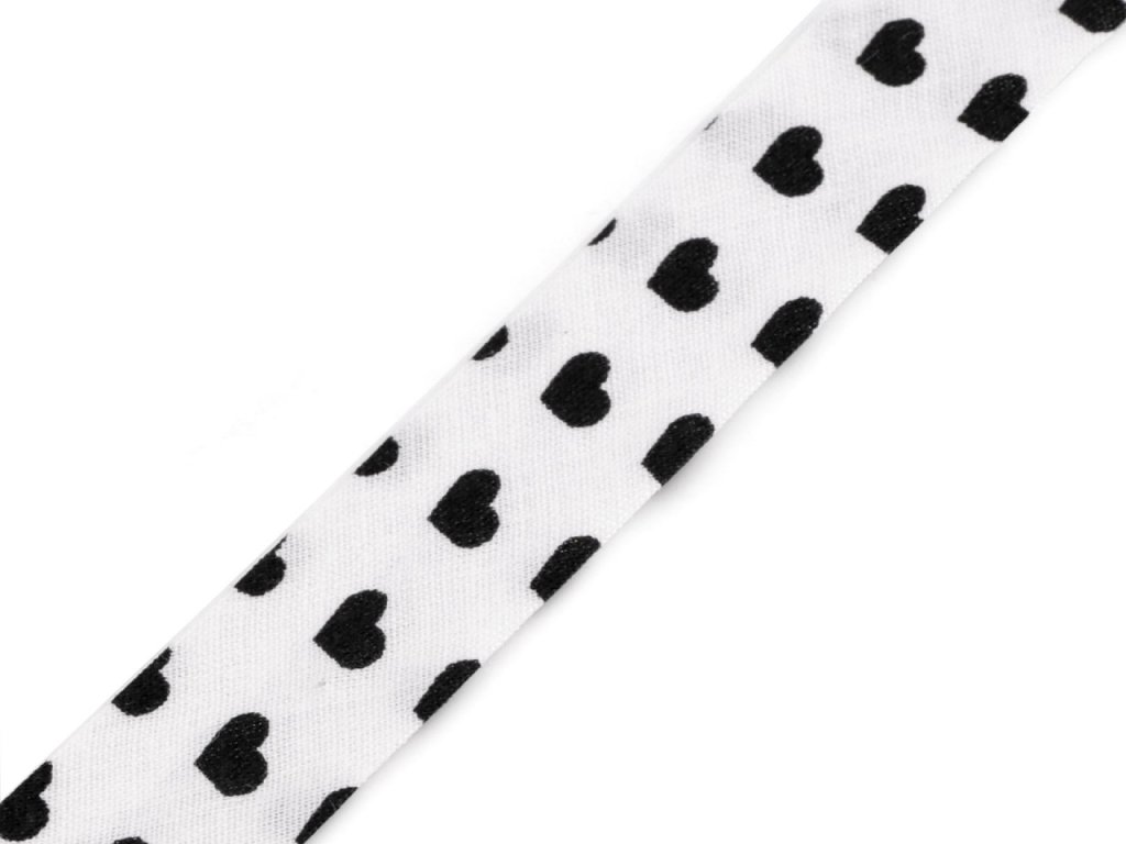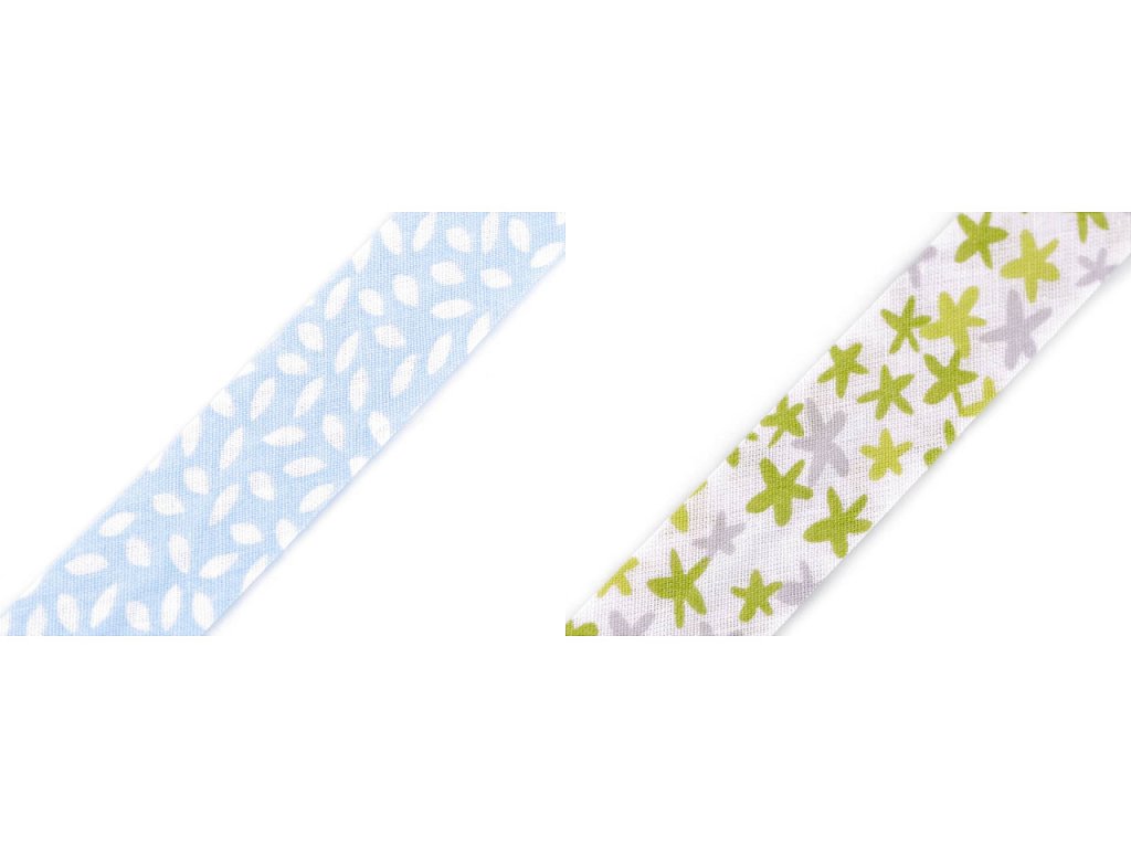 Bavlněný šikmý proužek s různými motivy je pevný a zažehlený. Po našití má poloviční šíři tzn., že tento proužek bude mít po našití šíři 10 mm.