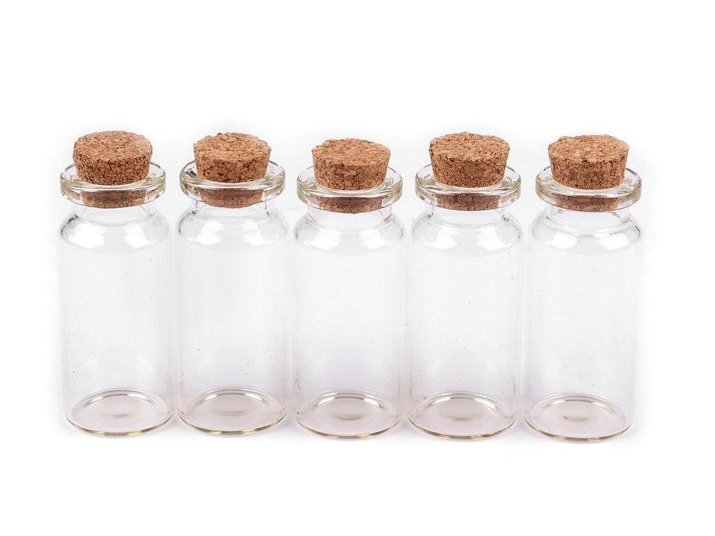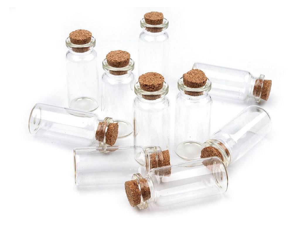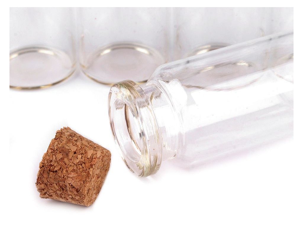 Praktické skleněné lahvičky vhodné na skladování drobných perliček jako je např. rokajl. Díky jejich průhlednosti jsou uskladněné korálky velmi přehledné. Ideální vybavení pro vaší tvořivou dílnu. Korkový uzávěr pevně uzavře obsah dózy.