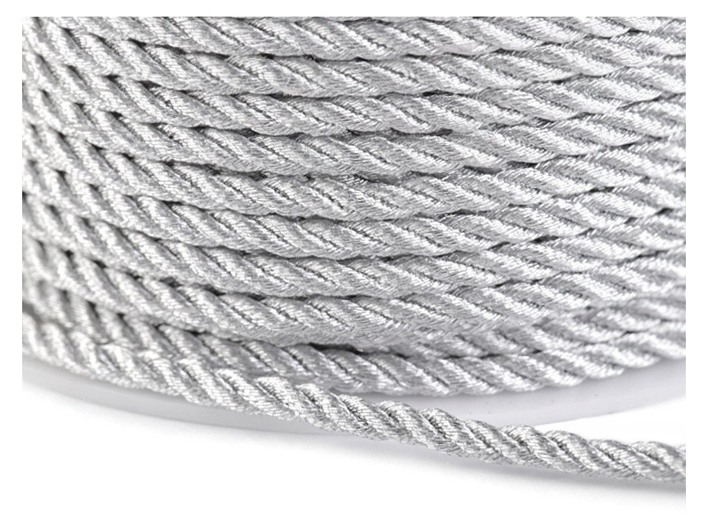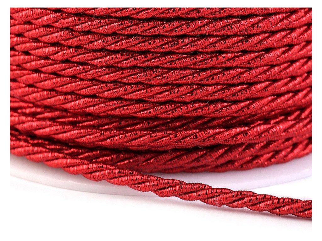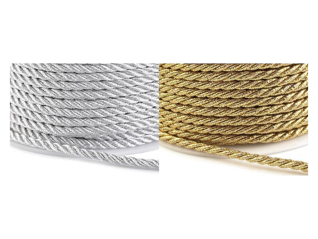 Krútená šnúra s lurexom sa efektne trblieta. Je zložená z troch tenších povrázkov. Jednotlivé povrázky majú bavlnené jadro opletené polyesterom a lurexom, ktorý spôsobuje žiarivý ligot. Použitie: Šnúru využijete v textilnom priemysle, v čalúníctve a pod. Je vhodná tiež na dekoračné účely, kde vynikne jej luxusný vzhľad.