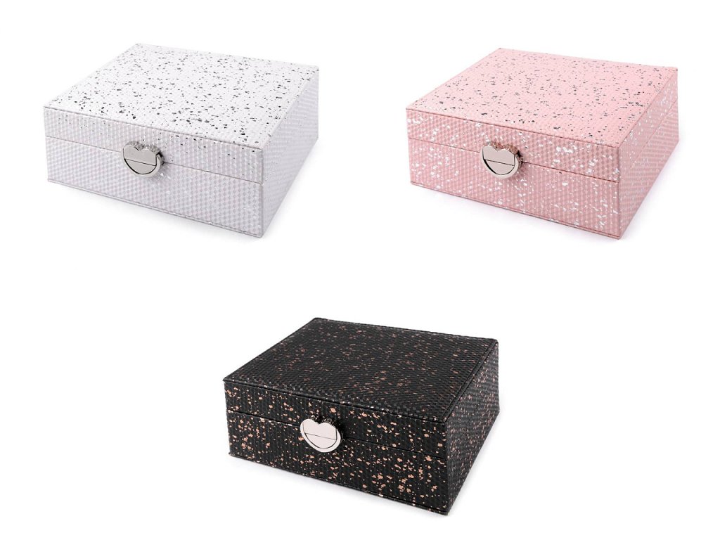 Šperkovnice vás na první pohled nadchne svým zajímavým povrchem se strukturou drobných 3D kostiček a metalickým potiskem. Má velice kvalitní a precizní provedení. Ochrání vaše šperky před nepříznivými vlivy okolí, jako je světlo nebo vlhkost. Součástí šperkovnice je kovové zapínání ve tvaru srdce. Uvnitř je 6 přihrádek, 2 polštářky na brože, hodinky či náramky, 2 oddíly na prsteny, přepážka na puzetové náušnice, kapsa, zrcátko a 6 háčků na zavěšení.