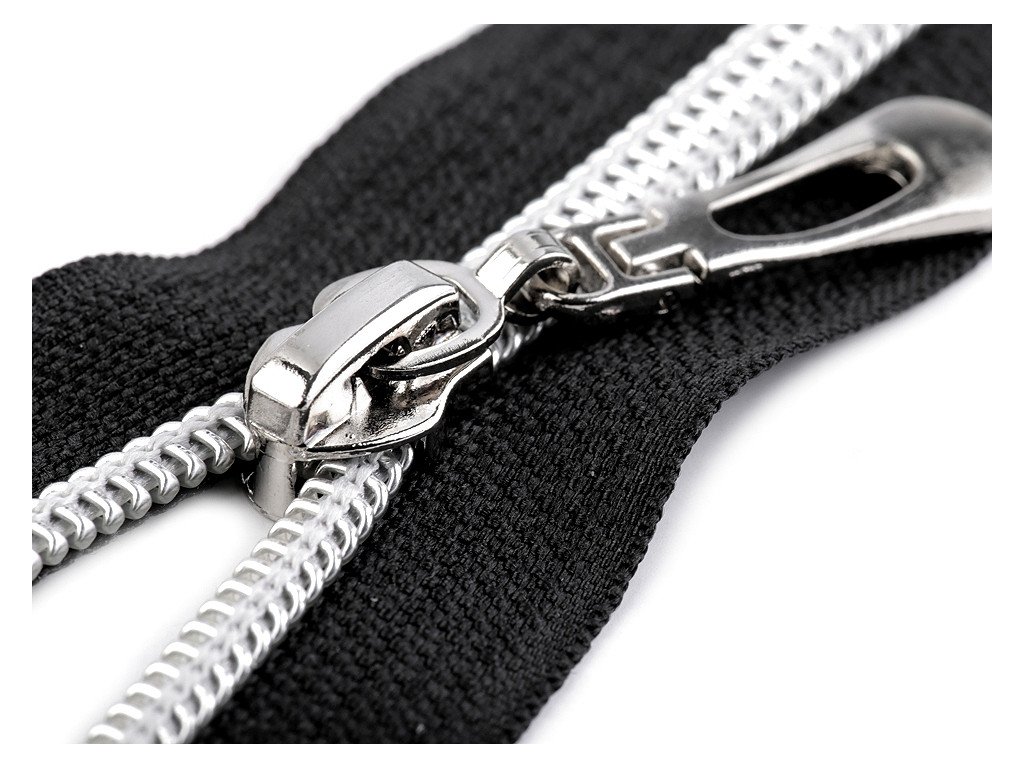 Spirálový zip se stříbrnými zoubky využijete jako zapínání na bundy, kabáty, mikiny i sportovní tašky. Zip je dělitelný. Jezdec je z nemagnetického kovu, očko, které ho spojuje se zipem je magnetické.