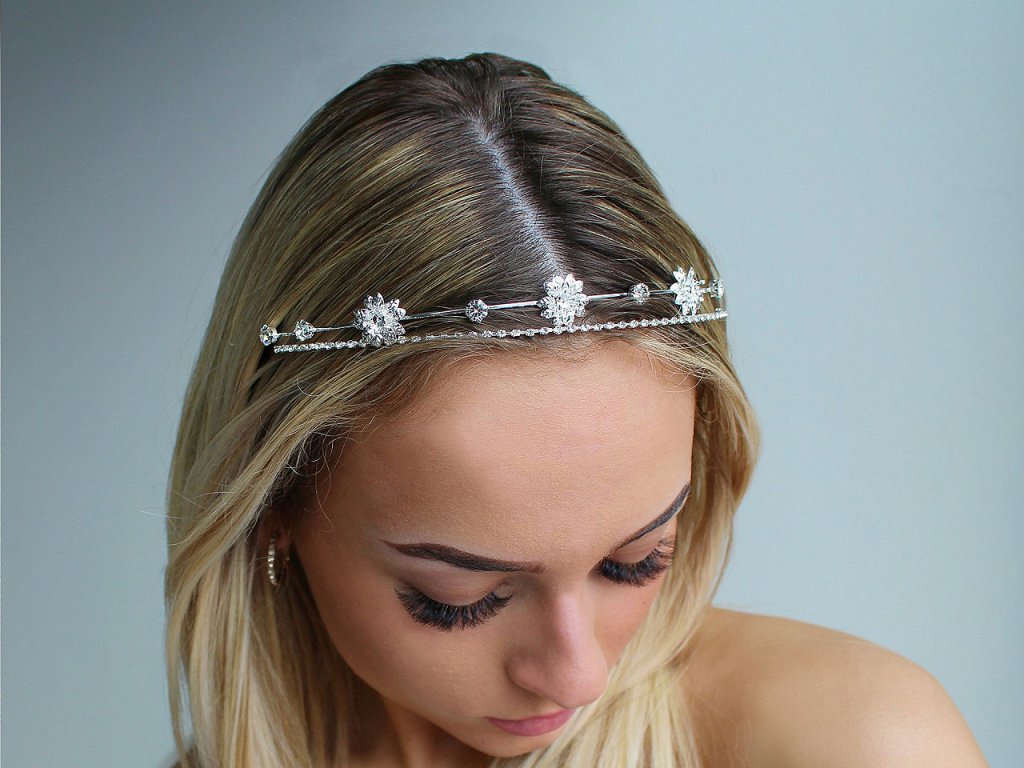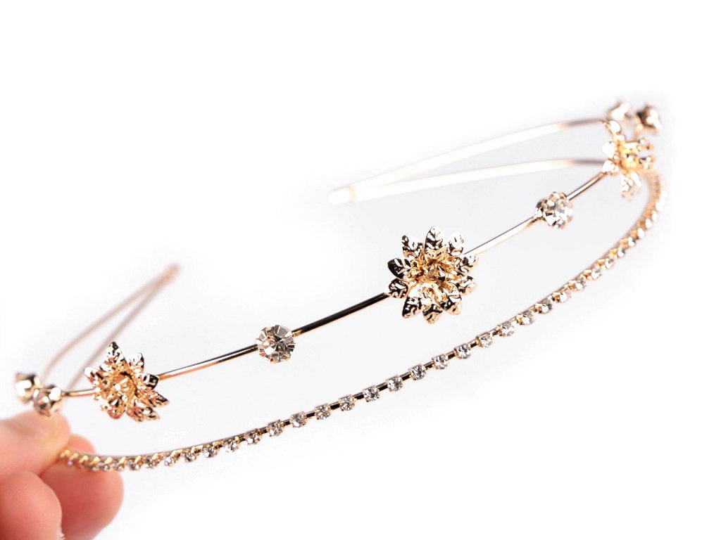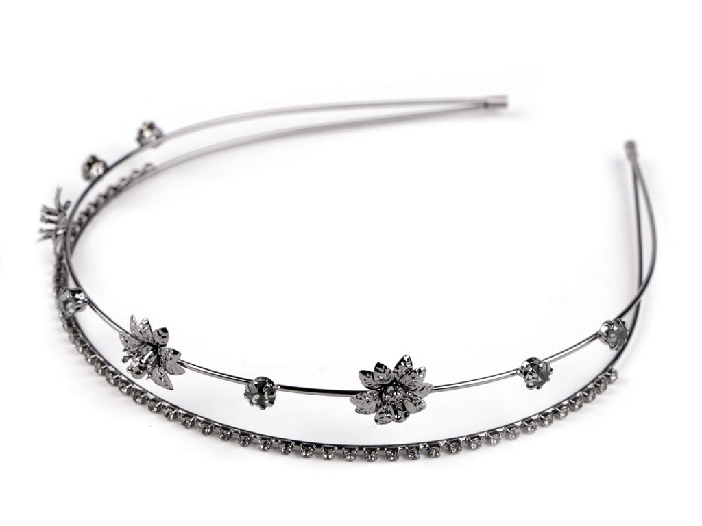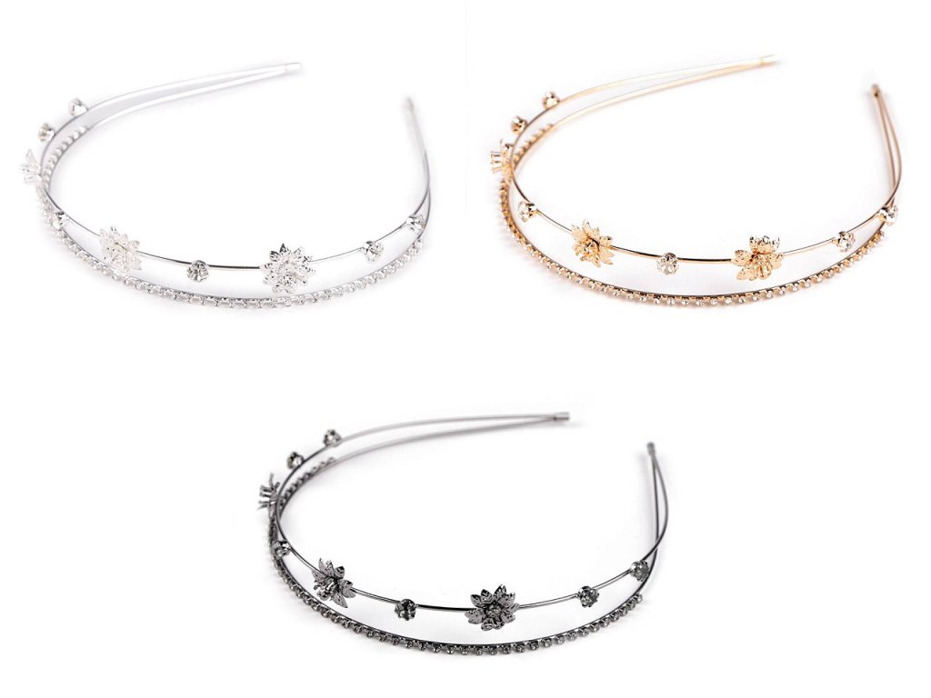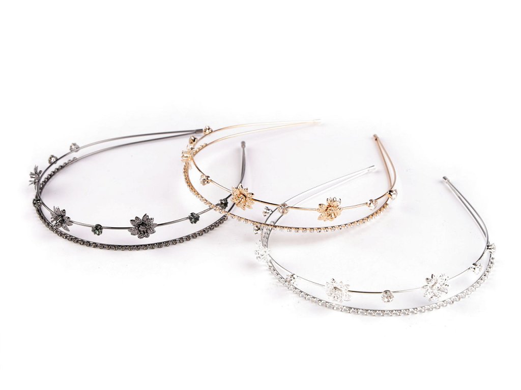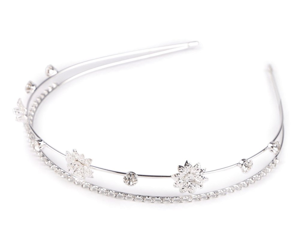 Dvouřadá štrasová čelenka slavnostně dozdobí účes pro jakoukoli příležitost. Vyniká svým rafinovaným designem, který kombinuje jemnost a eleganci. Z kovového drátu je vytvořená konstrukce, na níž jsou pevně připevněná kovová lůžka se skleněnými štrasovými kamínky a květy. Čelenka působí jemným dojmem, díky kamínkům se oslnivě třpytí. Dá se kombinovat s různými druhy účesů, od uvolněných kadeří po elegantní drdoly.
