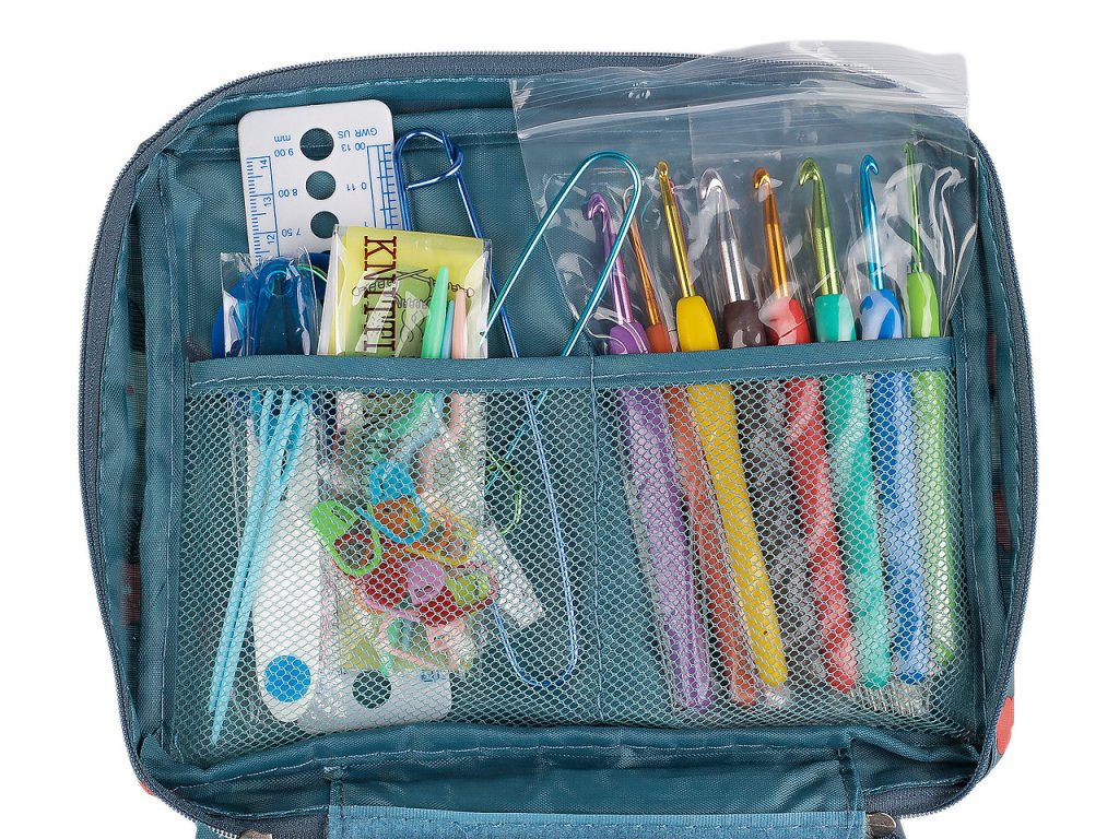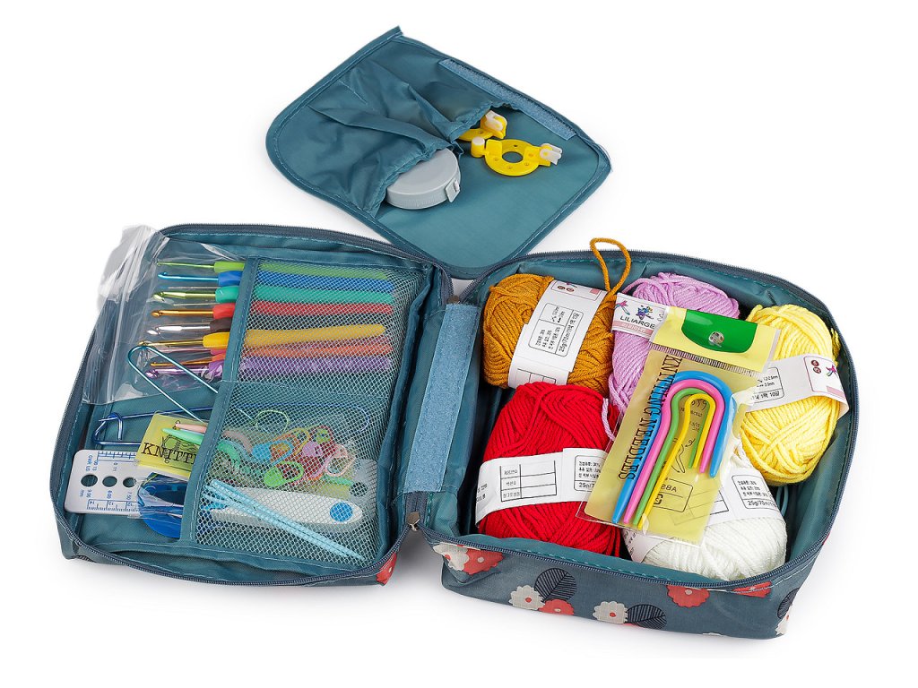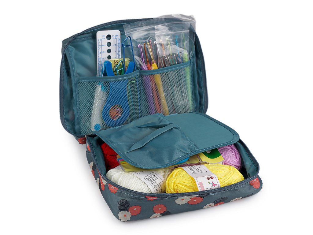 Materiál: polyester, plast, kov, hliník, Rozměry pouzdra:: 22 x 17 x 7 cm, Velikost:: 0,6 - 6, Sada:: 21 ks háčků, 57 ks pomůcek celkem