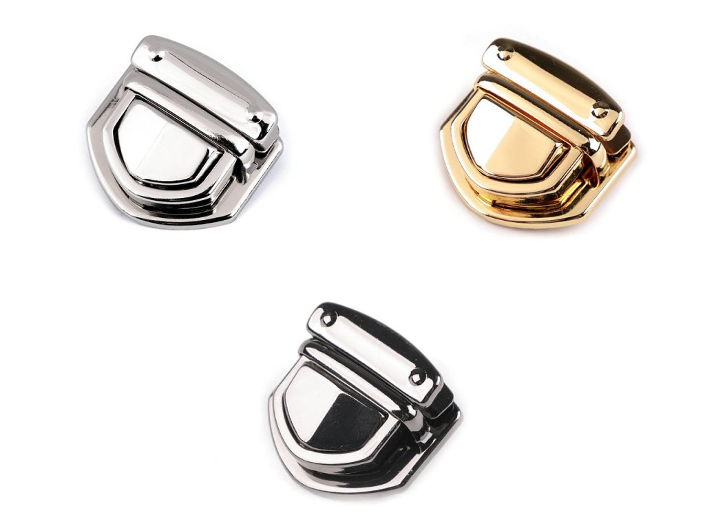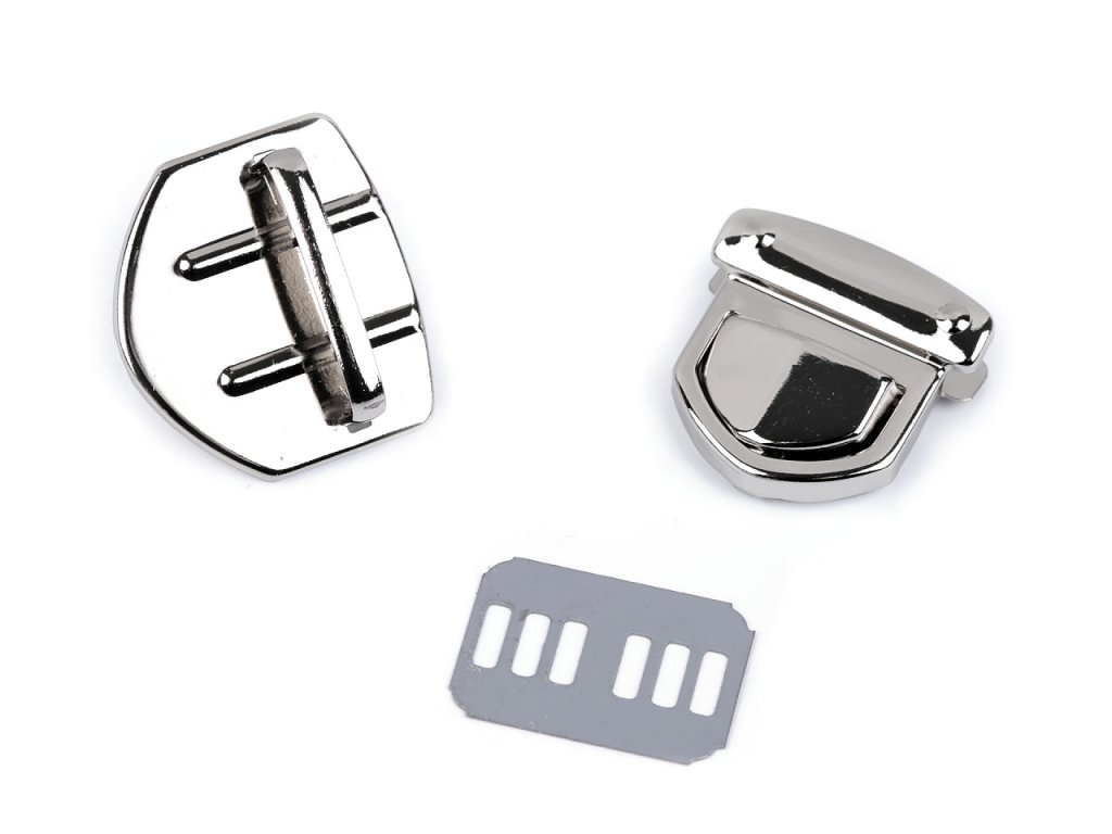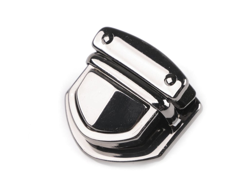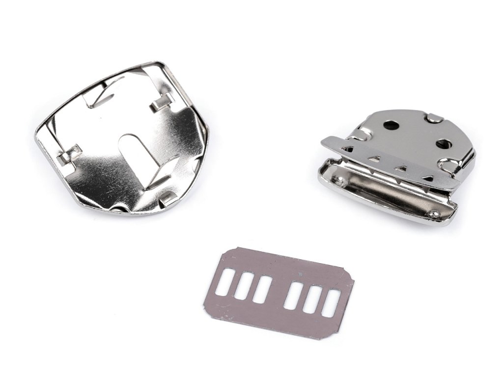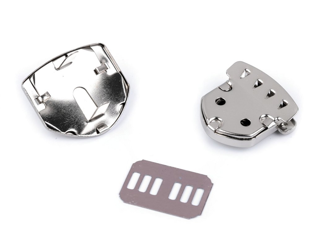 Klasické zapínanie na kabelku alebo tašku sa skladá z troch dielov. Pliešok sa pripevní na vnútornú časť tašky, diel s nôžkami na vonkajšiu časť (nôžky sa zaháknu do pliešku a roztiahnu) a tretí diel so zúbkami na jej chlopňu. Diel na chlopňu sa upevní tak, že roztvoríte čeľuste, na ktorých sú zúbky a medzi ne vložíte materiál, na ktorý chcete zapínanie upevniť. Následne čeľuste zovrite, zúbky tak zamedzia pohybu látky. Rozmery: - pliešok: 19 x 27 mm - diel s nôžkami: 30 x 33 mm - diel na chlopňu: 29 x 30 mm Celkové rozmery po zapnutí sú 30 x 33 mm.