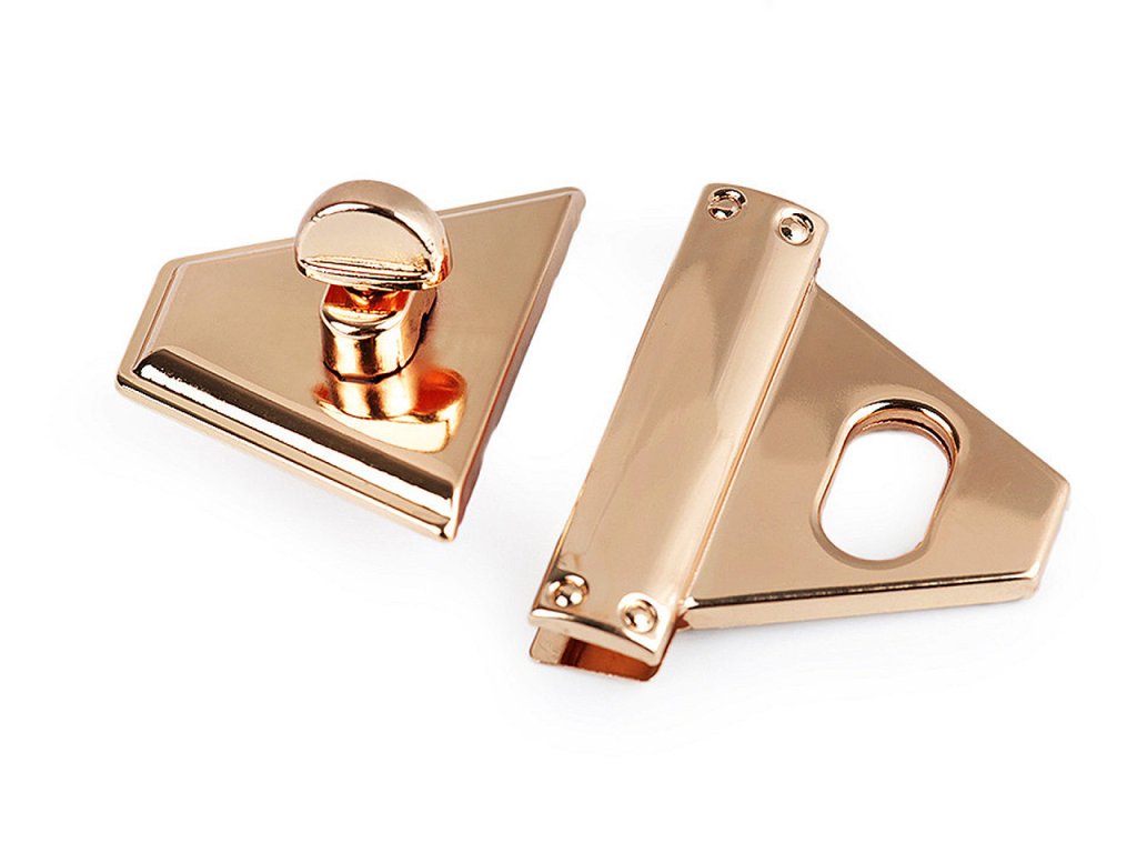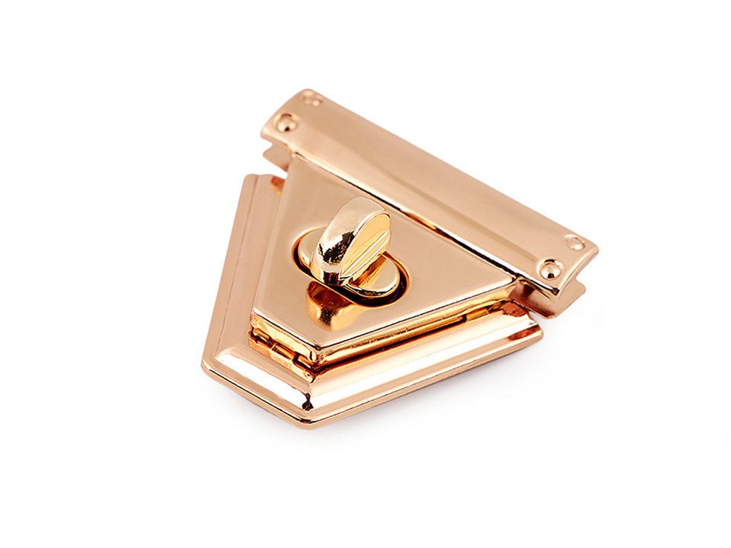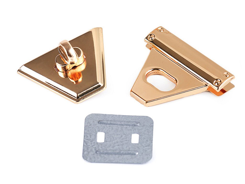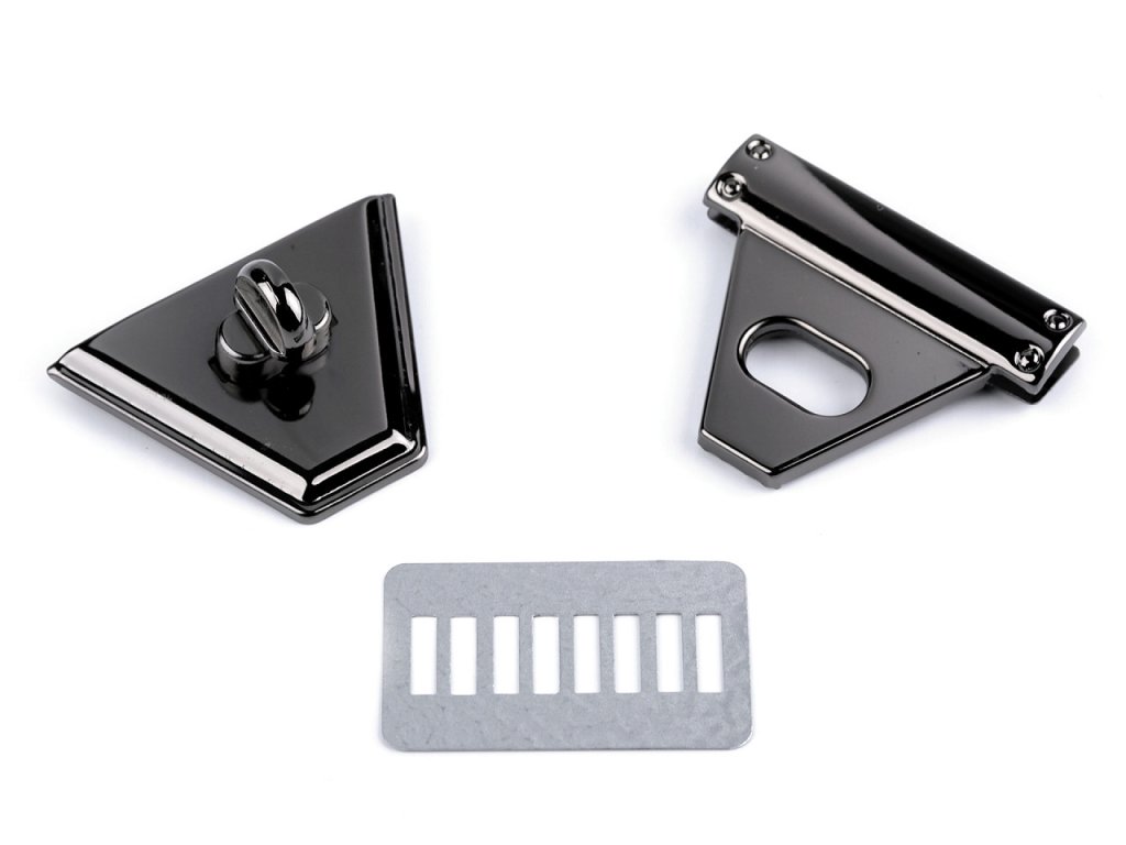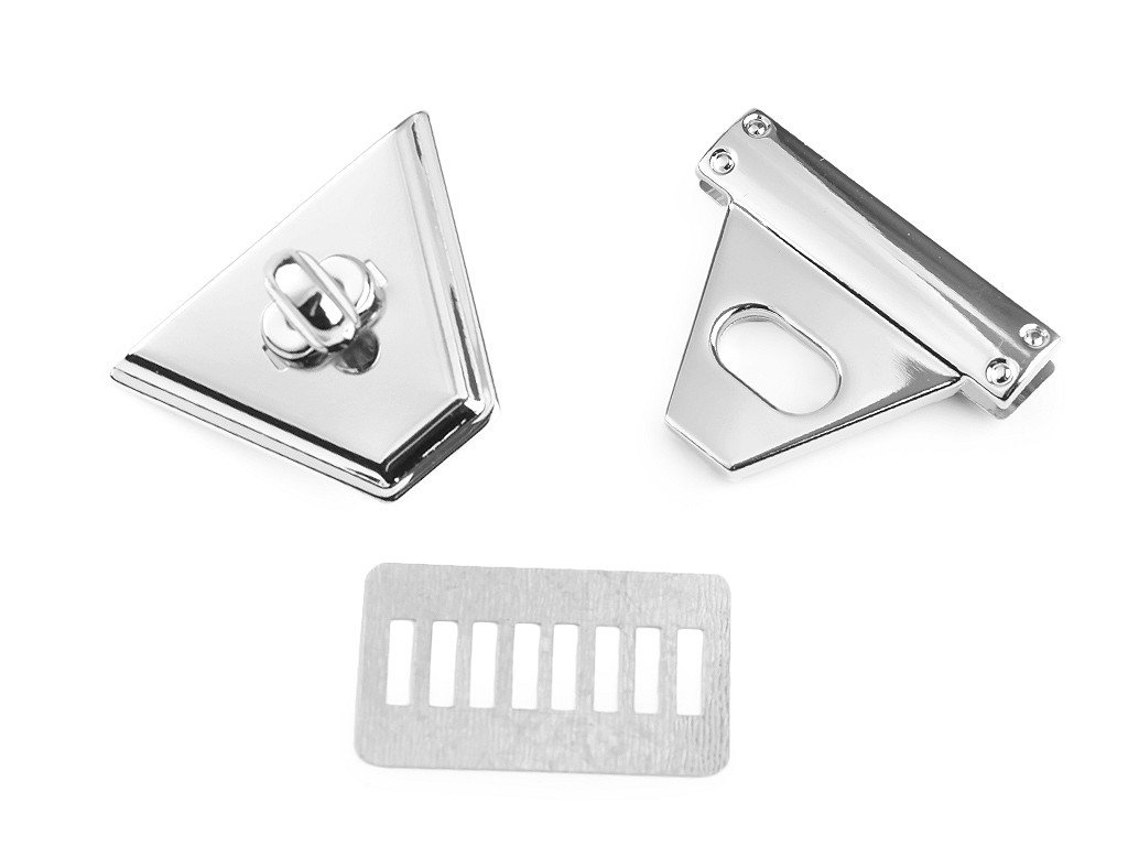 Klasické zapínanie na kabelku alebo tašku sa skladá z troch dielov. Pliešok sa pripevní na vnútornú časť tašky, diel s nôžkami na vonkajšiu časť (nôžky sa zaháknu do pliešku a roztiahnu) a tretí diel so zúbkami na jej chlopňu. Diel na chlopňu sa upevní tak, že roztvoríte čeľuste, na ktorých sú zúbky a medzi ne vložíte materiál, na ktorý chcete zapínanie upevniť. Následne čeľuste zovriete, zúbky tak zamedzia pohybu látky. Rozmery: - pliešok: 40 x 46 mm - diel s nôžkami: 42 x 45 mm - diel na chlopňu: 39 x 40 mm Celkové rozmery po zapnutí sú 45 x 45 mm.