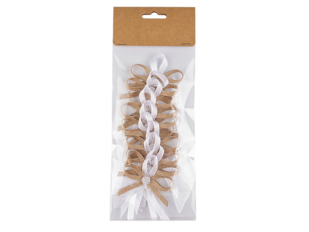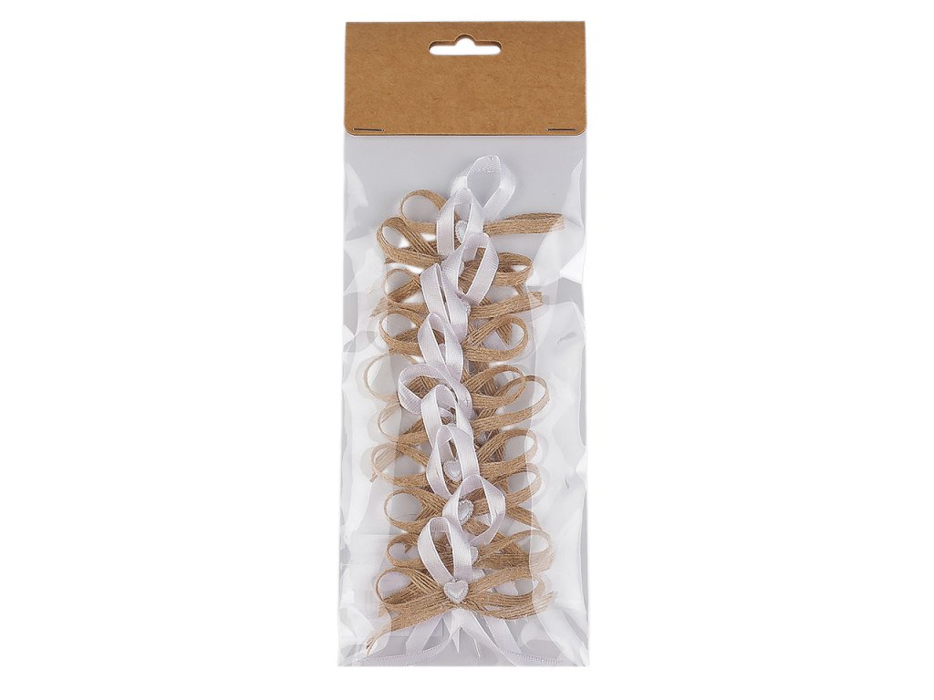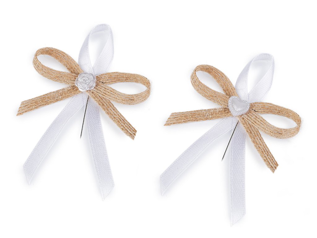 Svatební jutové mašličky v boho stylu jsou velice populární. Slouží především k ozdobení klopy ženicha a svatebčanů. Jsou kvalitní, ručně zpracované. Skládají se z jutové mašle, saténové stuhy, drobné aplikace s perlovým leskem a špendlíku. Mašličky můžete použít také k aranžování různých svatebních dekorací.