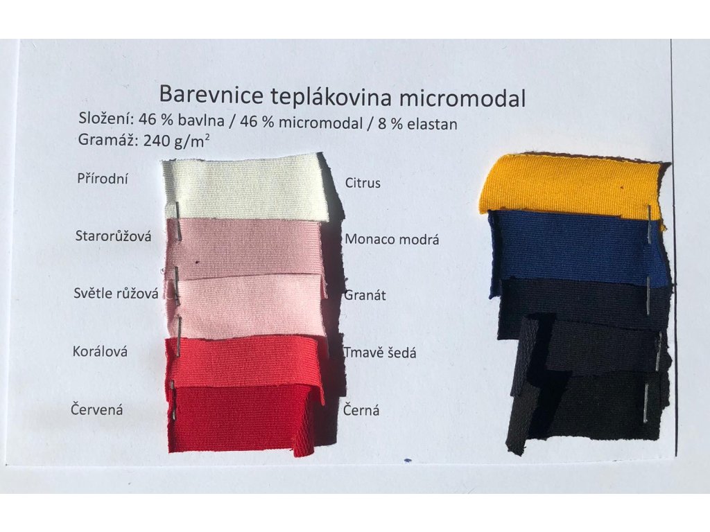 Tato teplákovina sestává z jemné bavlny, modalu a elastanu. Díky modalu si oblečení lépe zachovává svou měkkost, krásné barvy a tvar i po mnoha vypráních. Tato kombinace dělá teplákovinu vzdušnější a lépe savou.