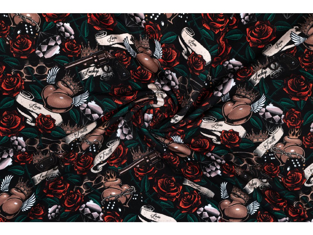 Teplákovina ruže, lebky, zbraň