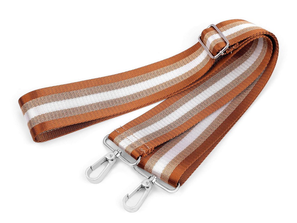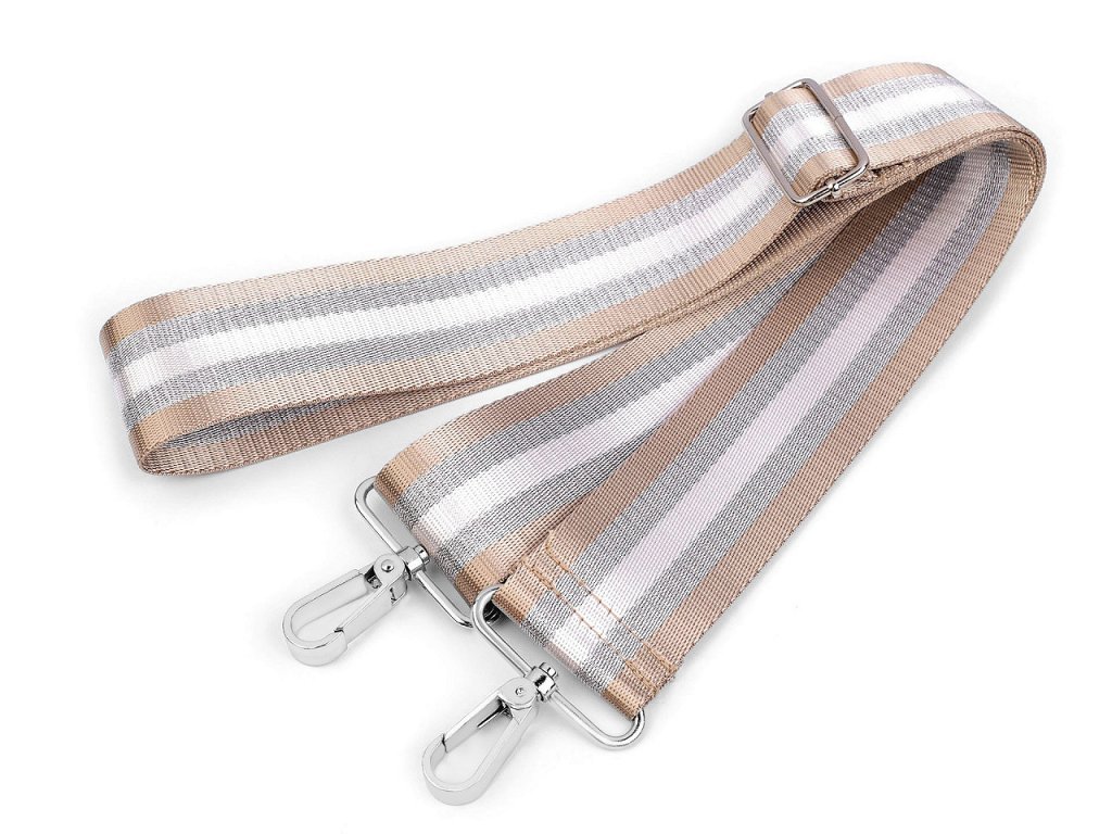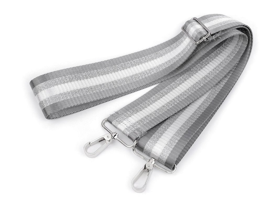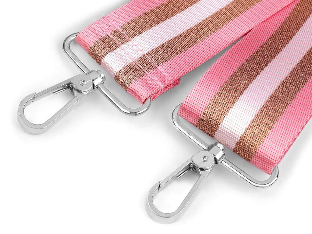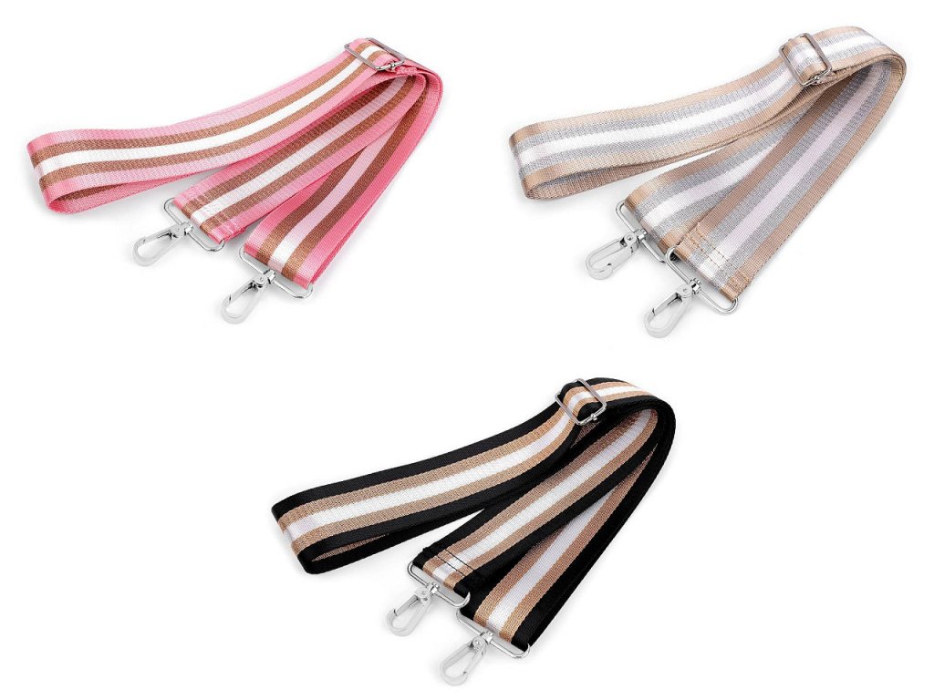 Textilný popruh vyniká lurexovými pruhmi , ktoré sa pútavo trblietajú. Je obojstranný. Na každej strane má kovovú karabínu, takže ho ku kabelke či taške ľahko pripnete. Dĺžku môžete regulovať.