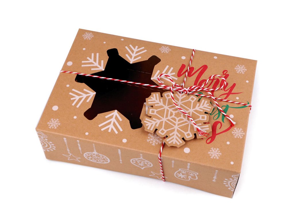 Krabička s poutavým vánočním potiskem a průhledem potěší děti i dospělé. Je ideální na zabalení vánočního dárku nebo ji můžete naplnit dobrotami na Mikuláše. Víko má odklápěcí, spojené s krabičkou. Průhled je z průhledné fólie. Součástí balení je bavlněný provázek na ozdobné ovázání a jmenovka s potiskem.