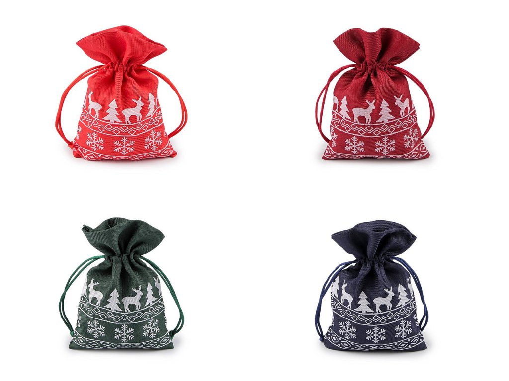 Vánoční dárkový pytlík je z obou stran ozdobený potiskem sobů, stromečků a vloček. Můžete ho použít na dárky nebo ho naplnit mikulášskou nadílkou, ušetří vám čas při balení. Dá se naaranžovat i jako vánoční dekorace. Stahuje se pomocí kulatých saténových šňůrek, dárku dodá osobní kouzlo a půvab.