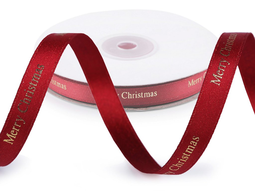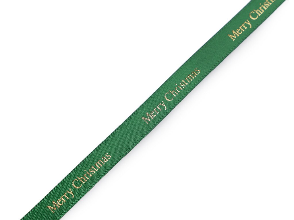 Dekorační stuha je ozdobená metalickým potiskem s nápisem "Merry Christmas". Potisk je jednostranný, stuha se jemně třpytí.