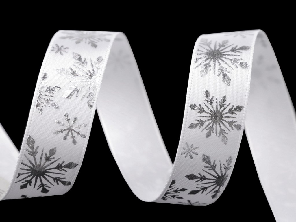Saténová stuha s metalickým potiskem vloček je velice kvalitní. Potisk je jednostranný, má jemný AB efekt.