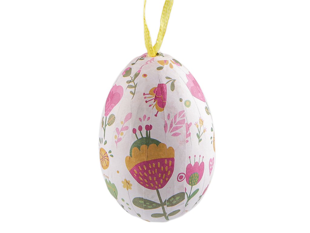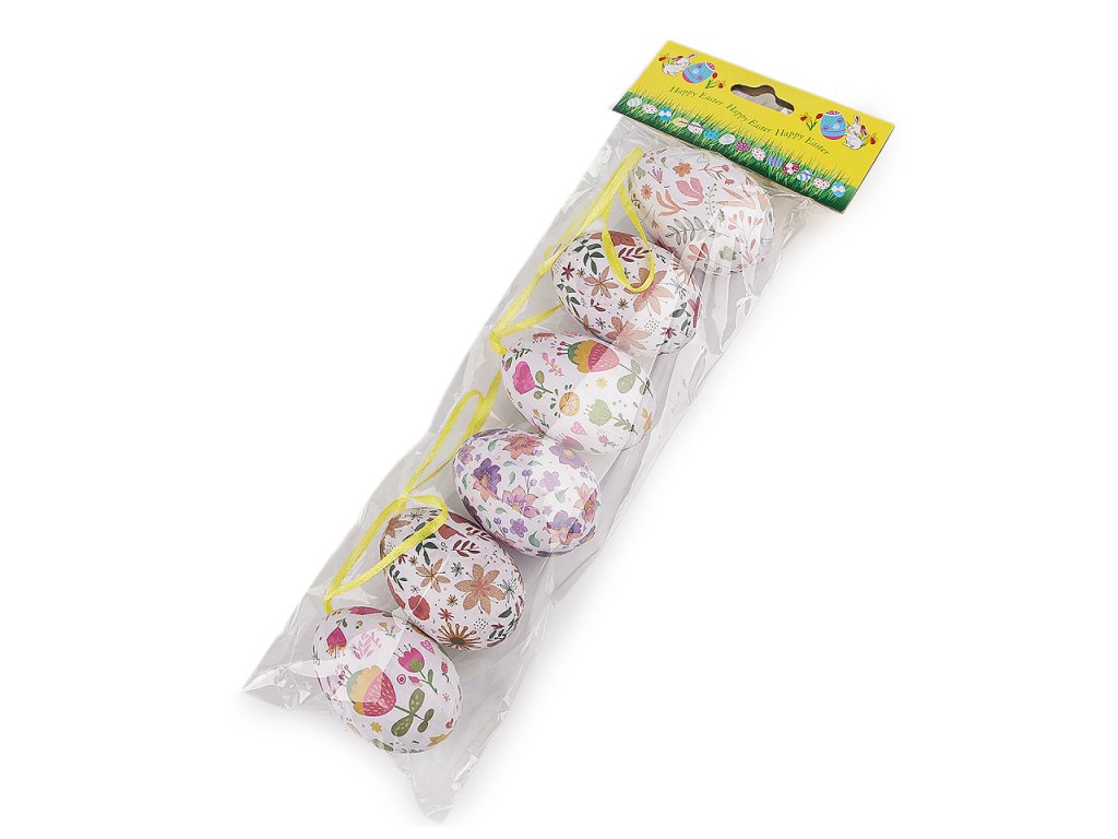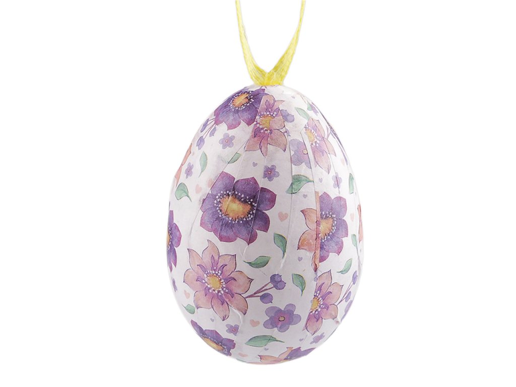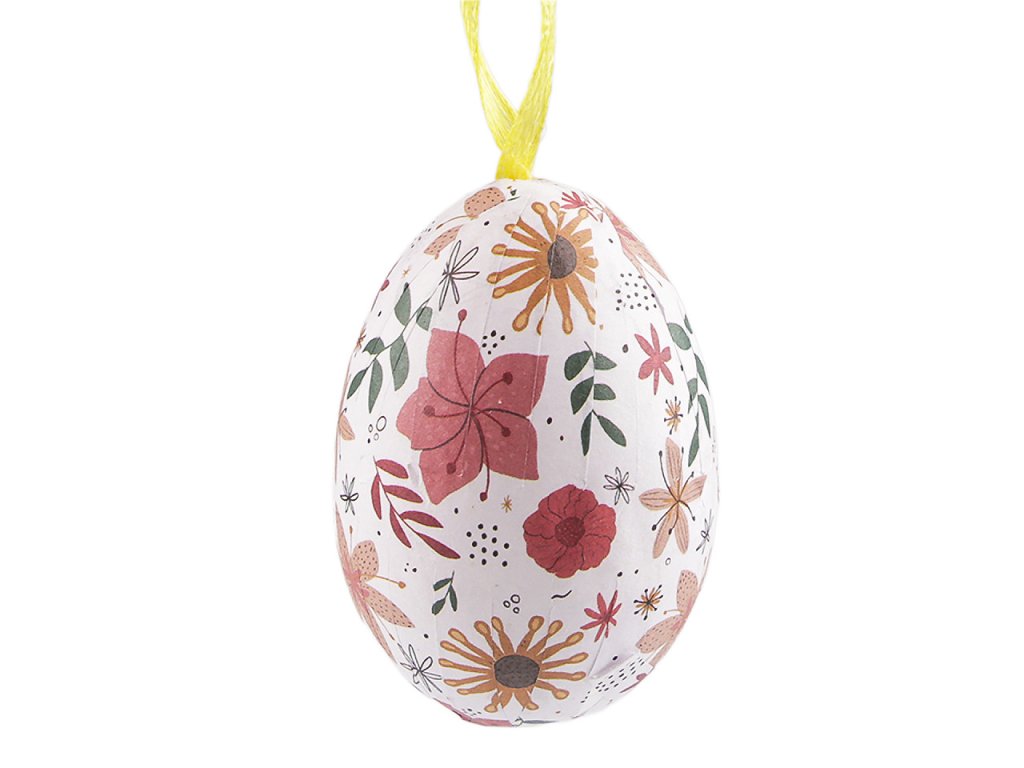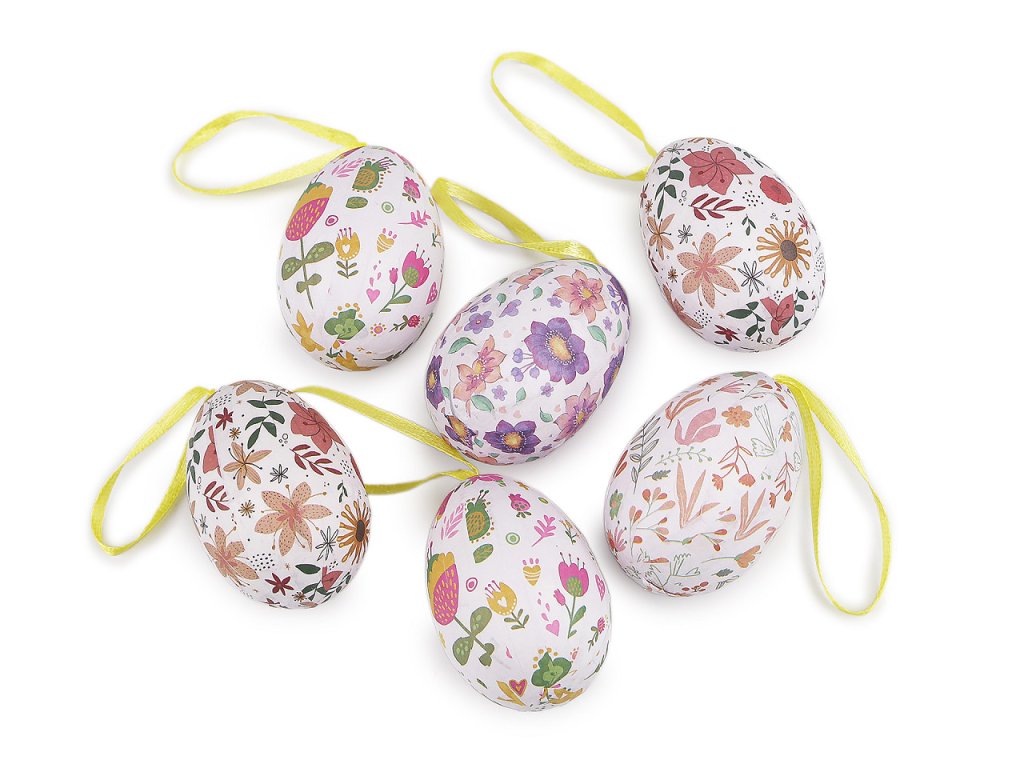 Velikonoční vajíčka s květinovými motivy jsou opatřená poutkem pro snadné zavěšení, což umožňuje jejich umístění na větvičky ve váze, věnce nebo do jarních aranžmá.